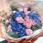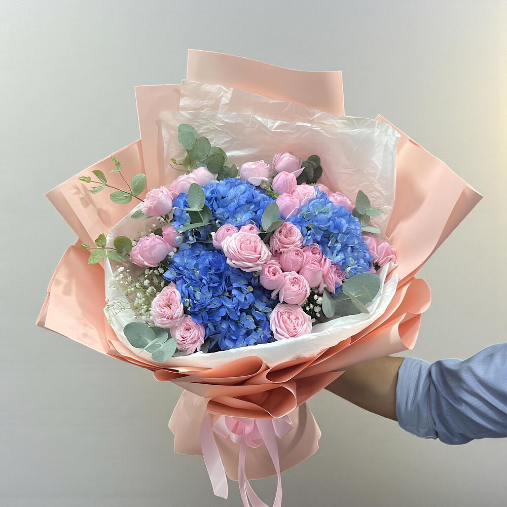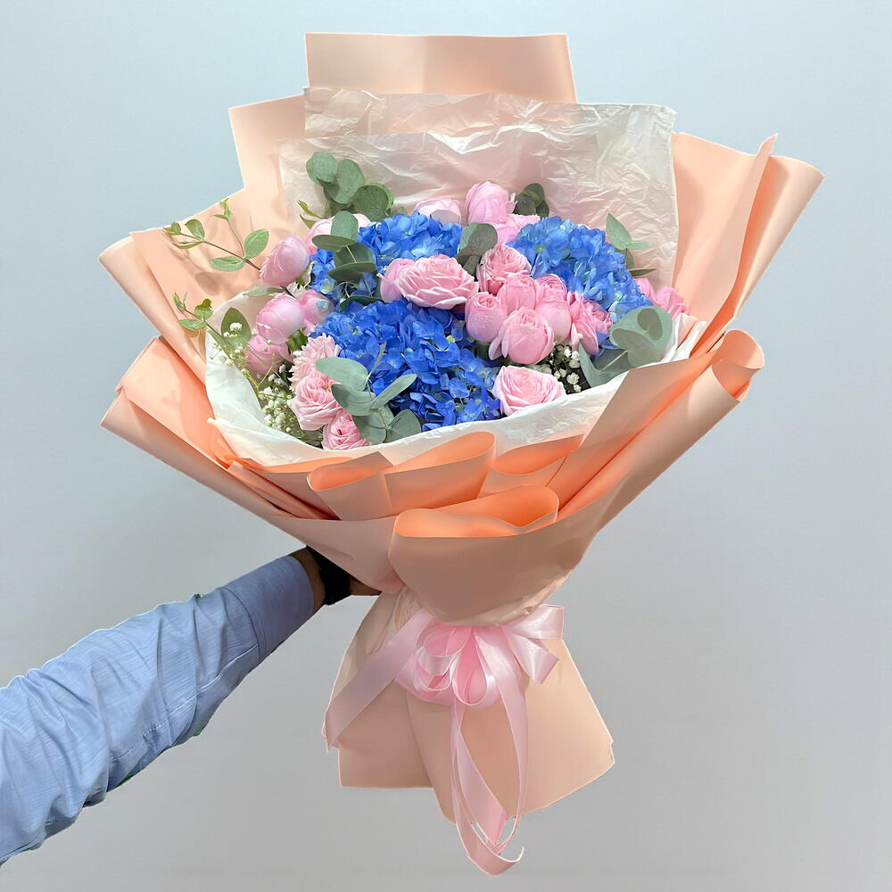 Encantador ramo azul y rosa | Hortensias con rosas spray | Entrega el mismo día en Emiratos Árabes Unidos