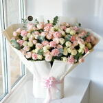 Este impresionante ramo de rosas en tonos rosa empolvado y marfil y delicados claveles es una verdadera expresión de gracia y belleza. Acentuado con hojas frescas de eucalipto, este arreglo floral irradia un encanto romántico, perfecto para aniversarios, cumpleaños y gestos sinceros de agradecimiento.