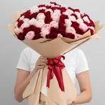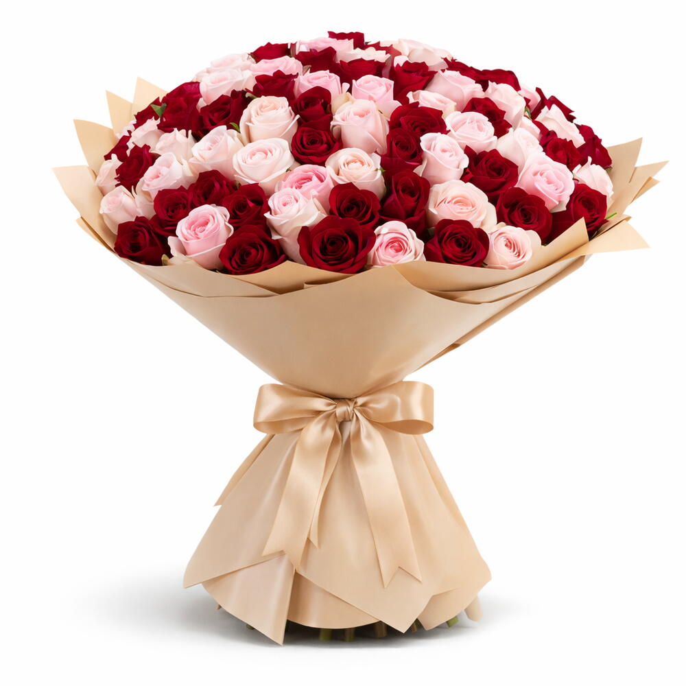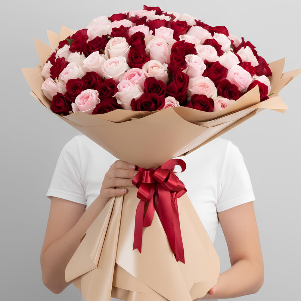 Un gran ramo de 101 rosas premium, en rojo intenso y rosa rubor, elaborado para hacer que los corazones se detengan. Las rosas rojo intenso hablan de devoción. Las suaves rosas rosa rubor susurran ternura. Juntas, crean una declaración audaz pero elegante—perfecta para propuestas, aniversarios y momentos únicos en la vida. Arregladas a mano para un volumen y una simetría máximos, envueltas en elegantes tonos neutros y entregadas frescas el mismo día. No son solo flores. Es el momento que recordarán.