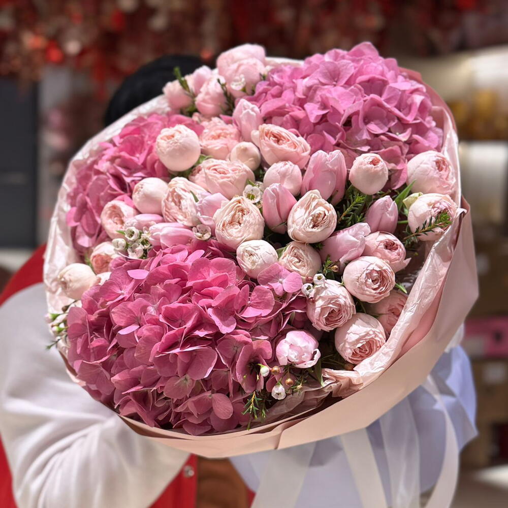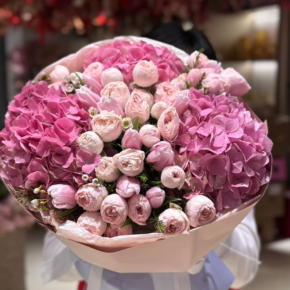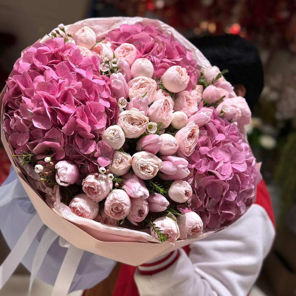 Un lujoso ramo envuelto en suaves tonos rosados, donde voluminosas hortensias se encuentran con delicadas flores de jardín en una composición armoniosa. Los suaves tonos rosados crean una sensación de calidez, ternura y serena elegancia, haciendo que este arreglo sea perfecto para momentos románticos, celebraciones especiales o regalos sentidos. Ligero, refinado y expresivo, Blush Embrace captura la belleza del amor en su forma más elegante.