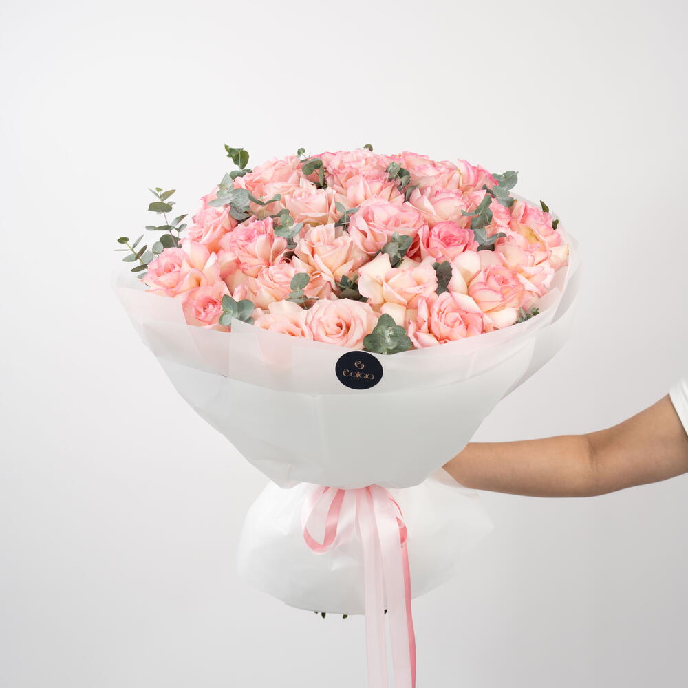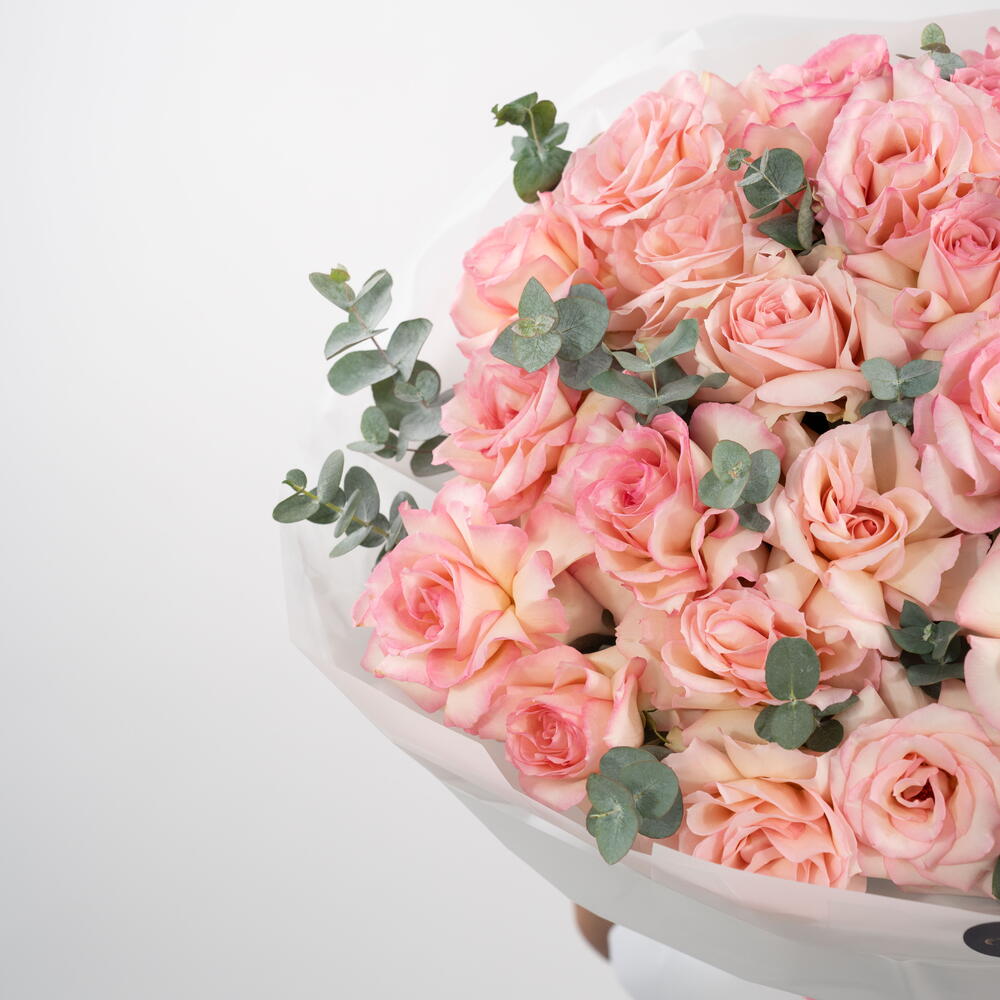 Blush Étoile es un ramo elegante de rosas premium color rosa empolvado y durazno, delicadamente acentuado con hojas frescas de eucalipto. Diseñado para expresar ternura, amor y elegancia, este ramo está envuelto en papel translúcido blanco suave y rematado con una cinta rosa empolvado — un regalo atemporal para momentos significativos. Perfecto para cumpleaños, aniversarios, sorpresas románticas o simplemente para decir “Estoy pensando en ti.”