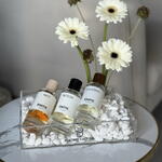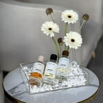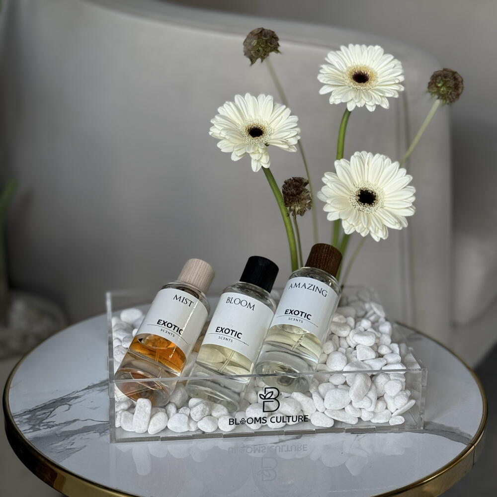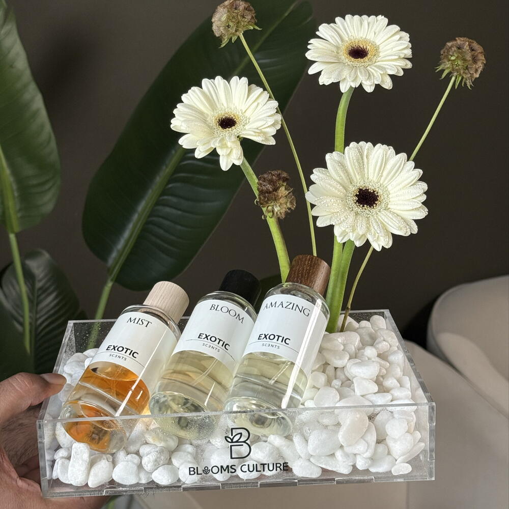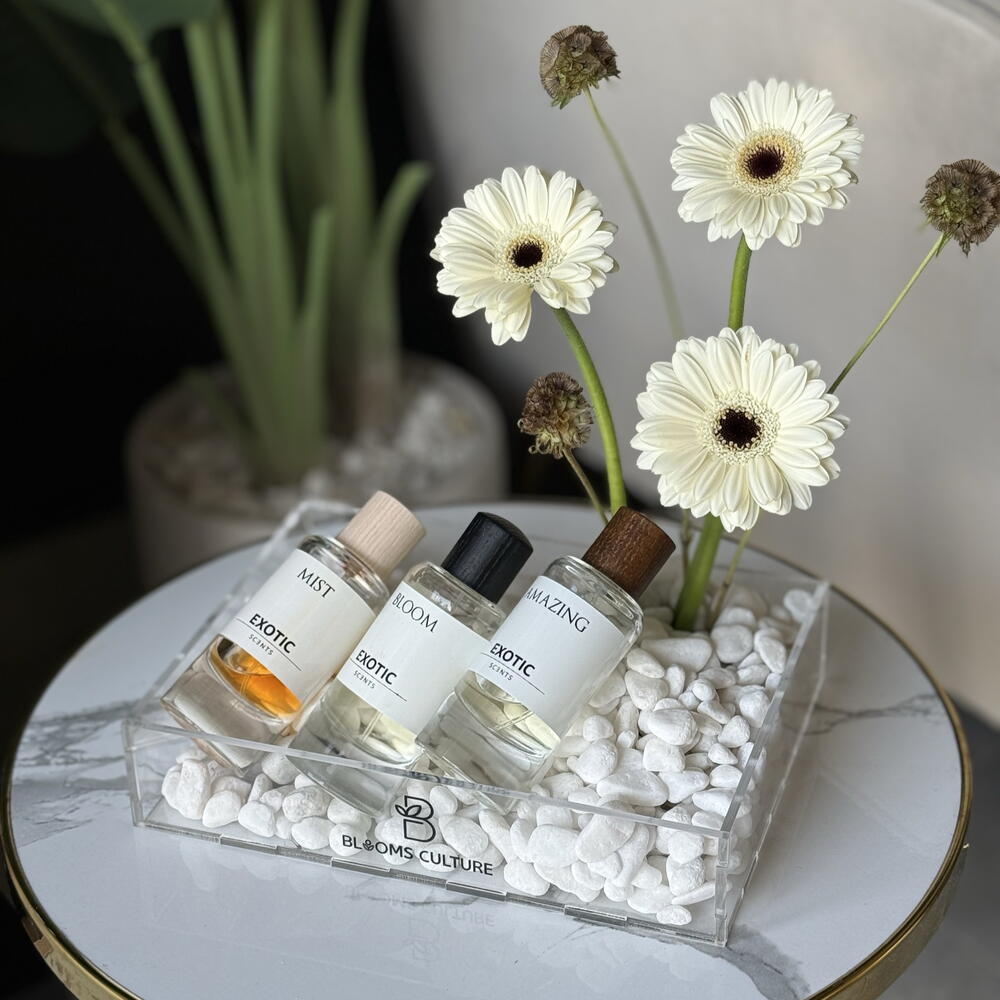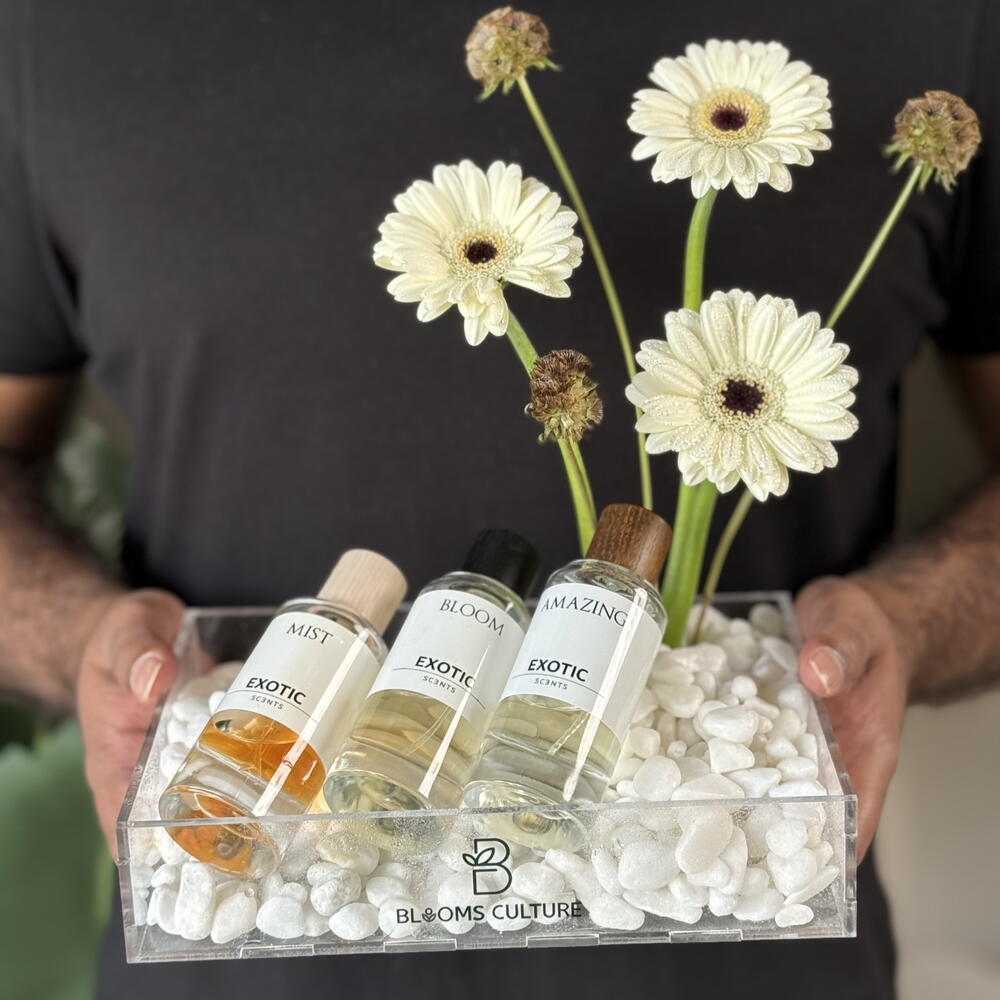 Gerbera - 3 ud. bandeja acrílica - 1 ud. flores edp - 1 ud. bruma edp - 1 ud. increíble edp - 1 ud. escabiosa - 3 ud.