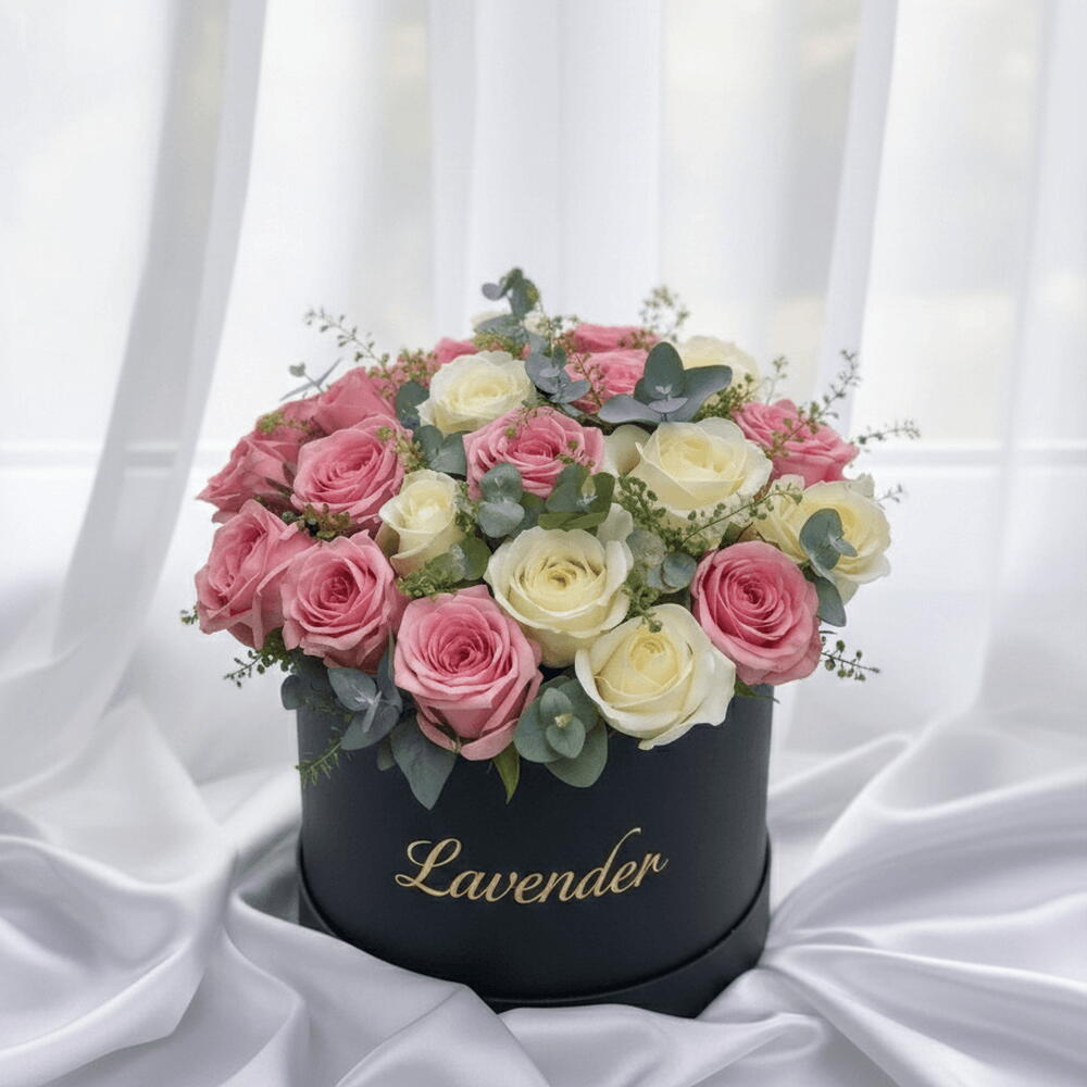 Celebrate elegance, strength, and timeless beauty with the Blush Harmony Rose Box, thoughtfully curated for Women’s Day. This luxurious arrangement features a delicate blend of soft pink and creamy white roses, beautifully complemented by fresh eucalyptus and subtle greenery. Designed in a premium matte black round box with refined gold lettering, this floral creation embodies sophistication and heartfelt appreciation. Graceful yet striking, this arrangement is a perfect symbol of admiration, gratitude, and love for the remarkable women in your life.
