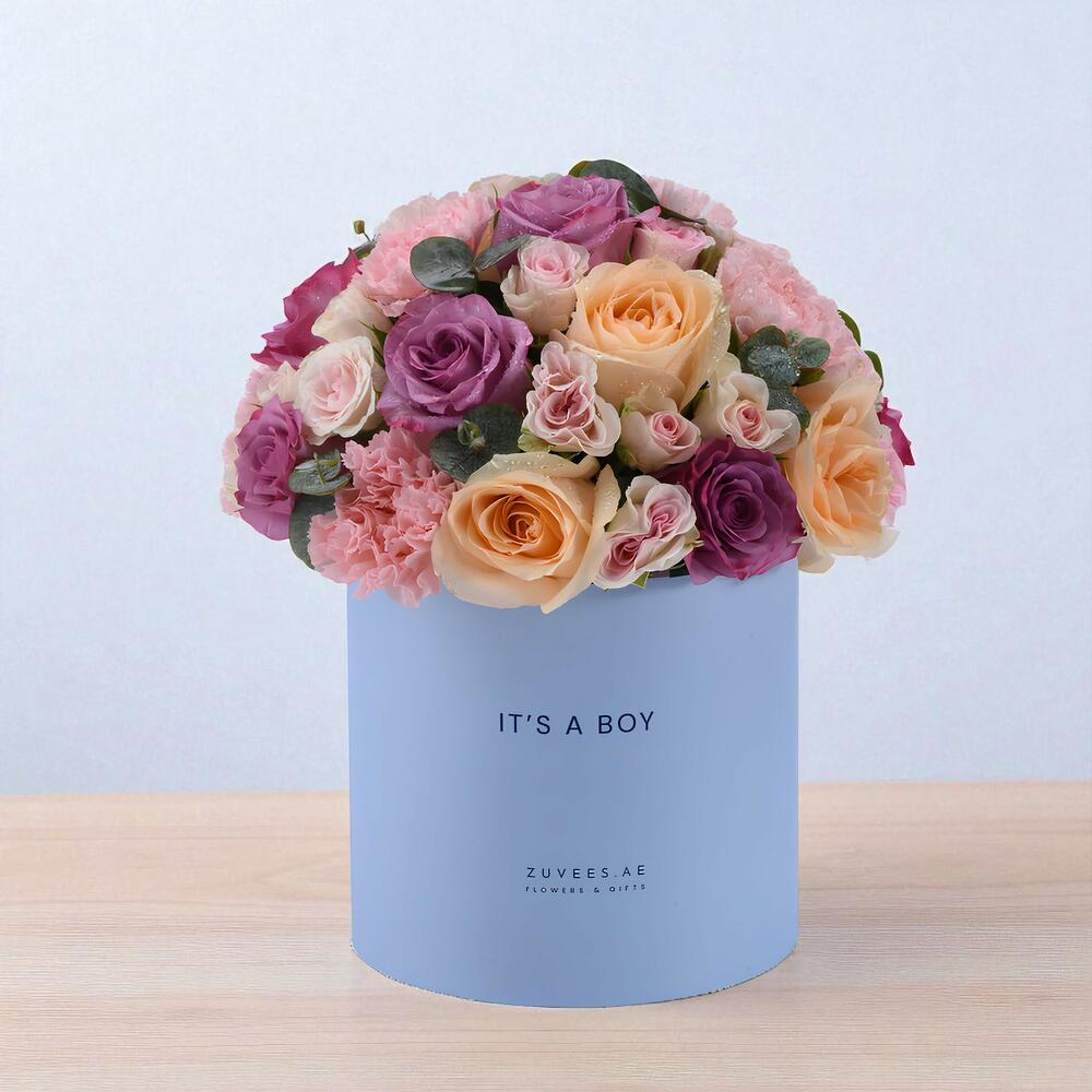Presentado en una caja premium azul claro adornada con el mensaje “Es un niño”, este regalo floral es un hermoso gesto para honrar los nuevos comienzos y colmar al pequeño de alegría.