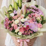 Un lujoso ramo extragrande en suaves tonos pastel, con una mezcla premium de capullos de lirio, mini rosas, crisantemo, claveles y alstroemeria, bellamente envuelto en elegante papel crema con cinta rosa. Perfecto para cumpleaños, felicitaciones, nacimiento de un bebé, gracias o pronta recuperación. Tallos de lirio (capullos): 4 tallos Mini rosa (blanca): 3 tallos Mini rosa (melocotón/rosa): 2 tallos Crisantemo (morado / lavanda): 4 tallos Crisantemo (rosa): 3 tallos Clavel (rosa): 3 tallos Alstroemeria (rosa): 3 tallos Lisianthus (blanco): 2 tallos Follaje verde: 5 tallos Nota de compra: Impresión gratuita de tarjeta de felicitación incluida con cada pedido. (Por favor, escriba el mensaje de su tarjeta al finalizar la compra.) Cambios de color de las flores: Puede solicitar cambiar los colores de las flores para que coincidan con su preferencia. Esto está sujeto a disponibilidad y puede variar según el stock diario. Complementos disponibles: Puede añadir artículos adicionales, como: Globos, letras, números, chocolates, perfumes y artículos de regalo (opcionales). Garantía de frescura: Siempre usamos flores frescas y garantizamos la mejor calidad posible en el arreglo.