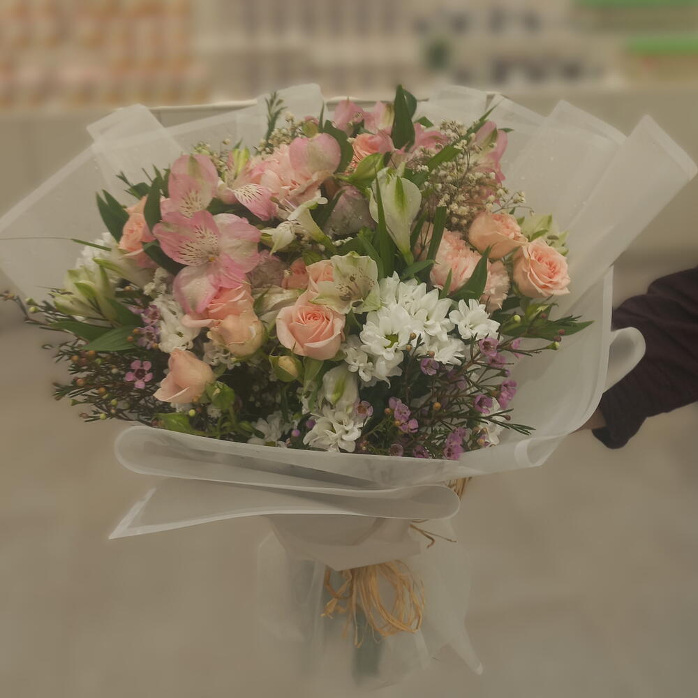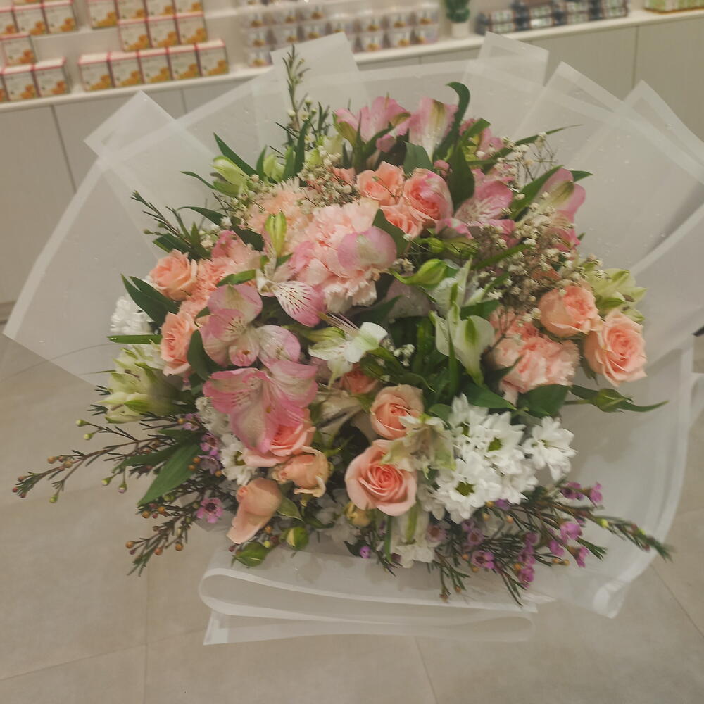 Un arreglo encantador: una mezcla de rosas spray rosadas, claveles y alstroemerias, combinada con flores santini y wox de un blanco nítido. Suave y alegre, este ramo encarna dulzura y encanto—perfecto para celebrar el amor, la amistad o los momentos alegres de la vida.