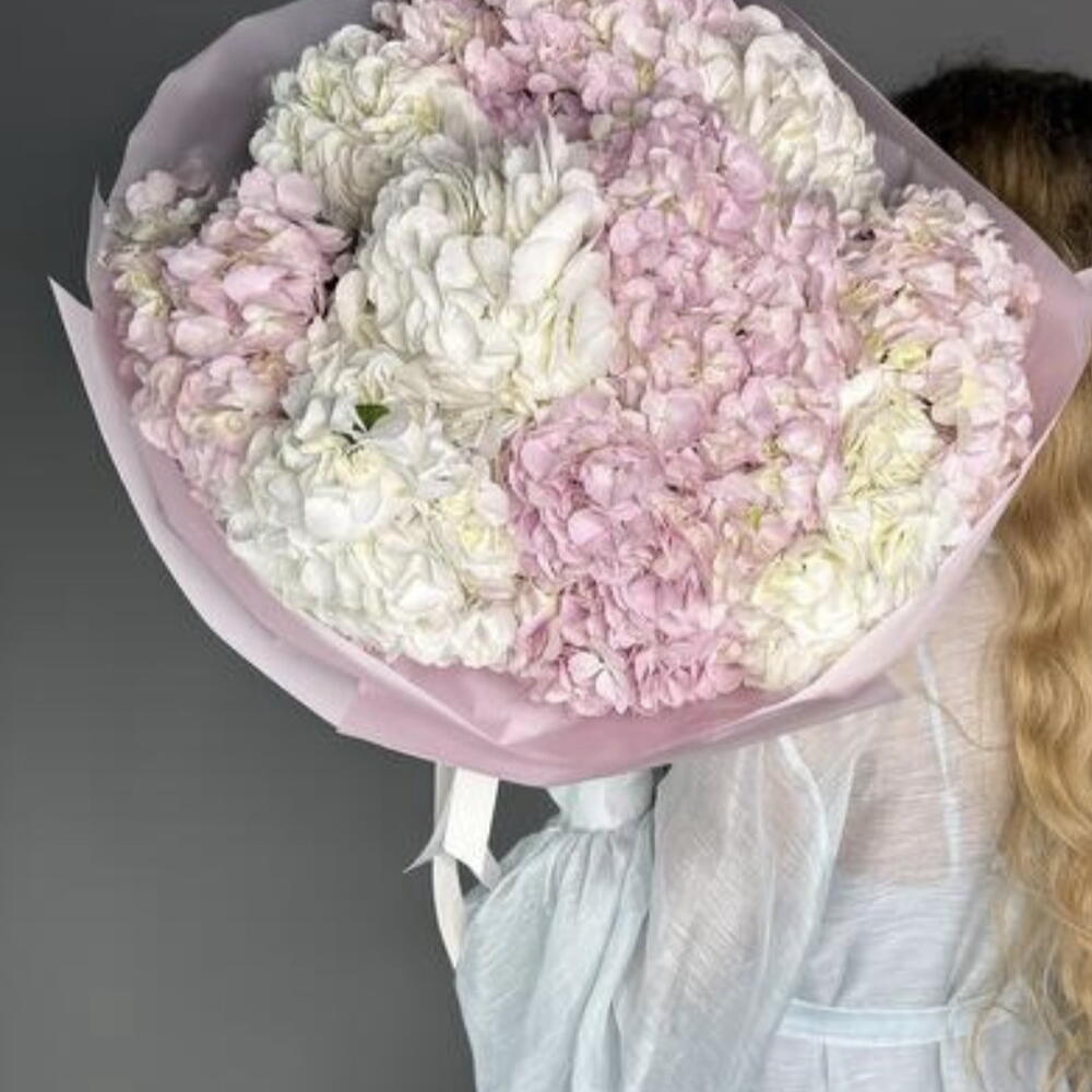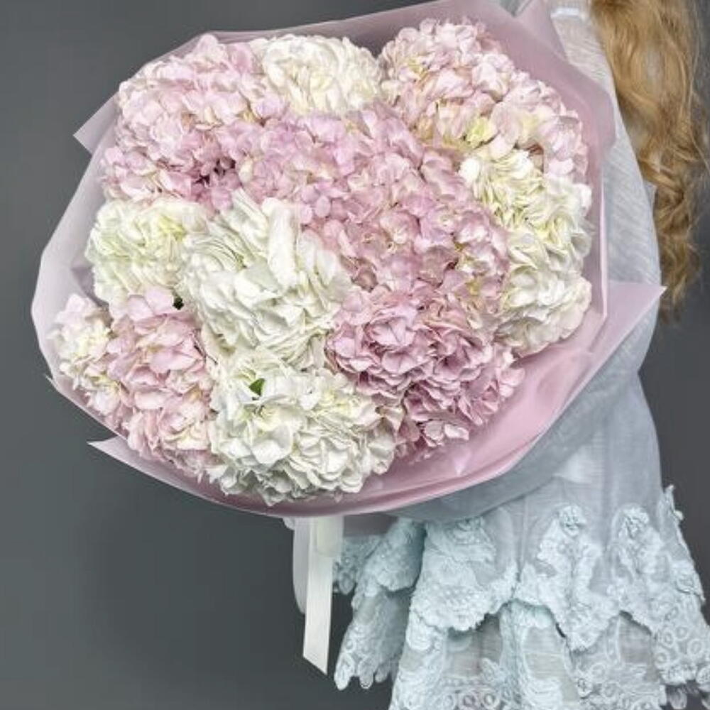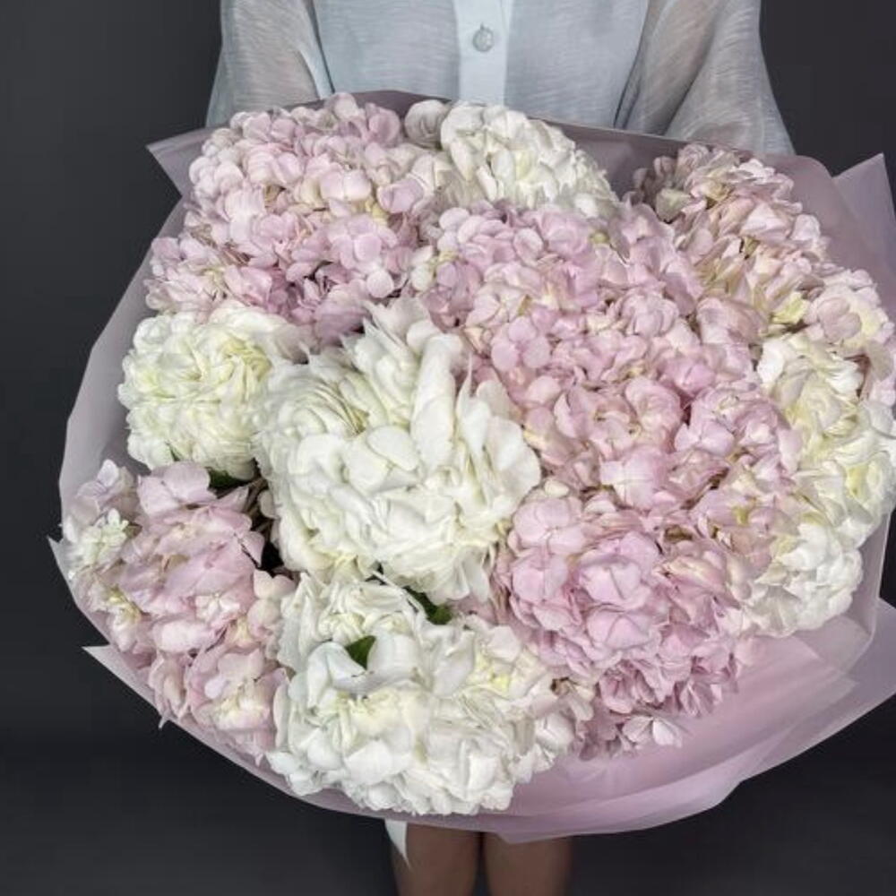 Un ramo elegante y sereno compuesto por 10 frondosas hortensias gigantes en delicados tonos rosa rubor y blanco nieve. El suave contraste de colores crea una composición floral refinada, ligera y armoniosa que resulta a la vez romántica y moderna.
