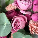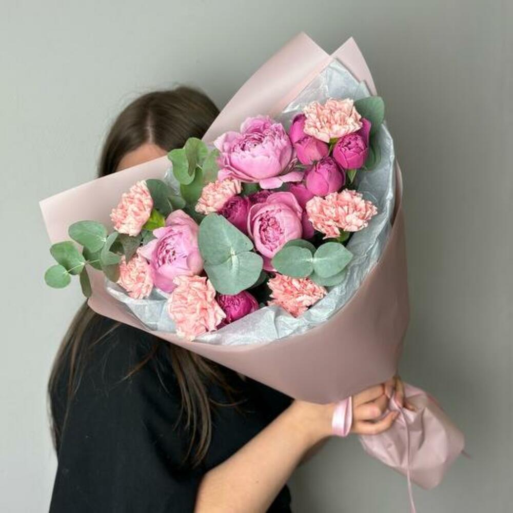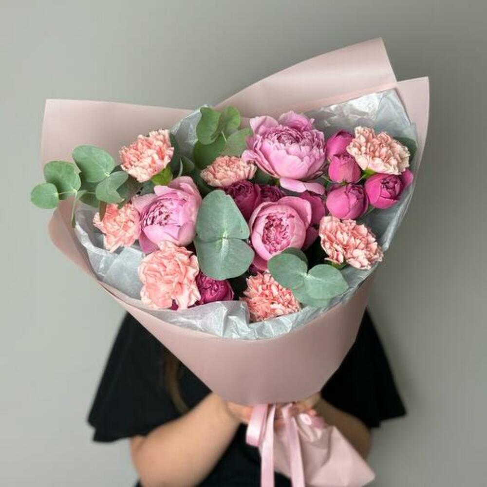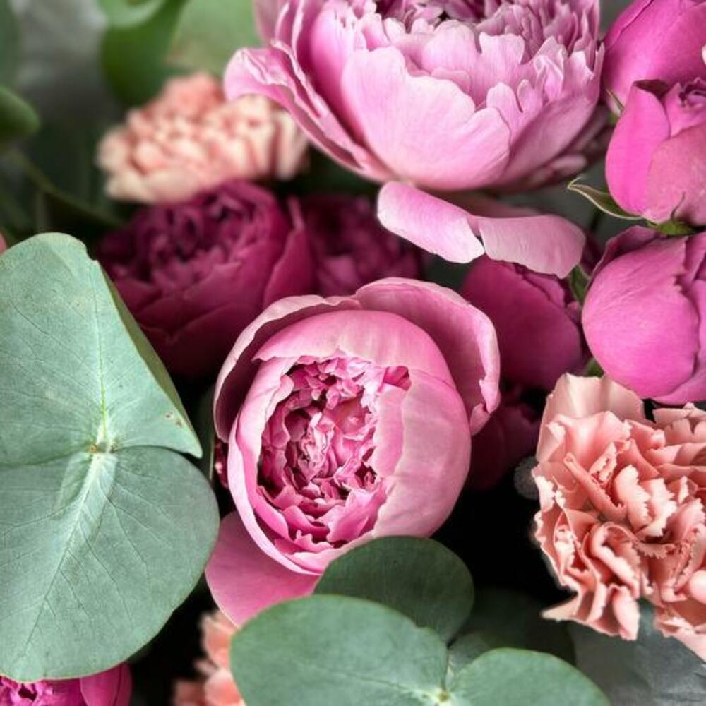 Eucalyptus - 2 ud. dianthus - 7 ud. burbujas brumosas rosa peonía - 3 ud. peonía sarah bernard - 3 ud. tissue paper white - 2 ud. envoltorio mate - 3 ud. cinta de satén rosa - 1 ud.
