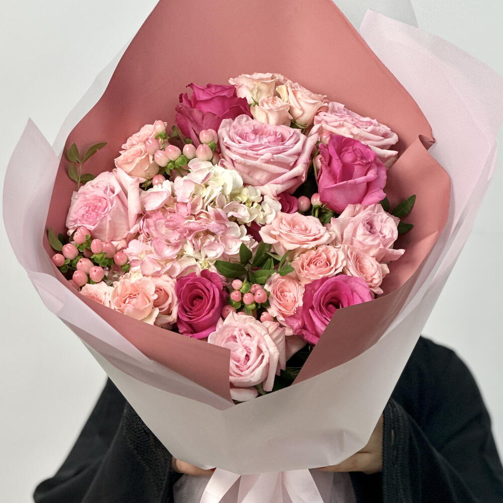 Este exquisito ramo combina una hermosa mezcla de rosas Ohara rosas, rosas fucsias y delicadas rosas en spray en Odilla, creando un arreglo vibrante y romántico. Las bayas de hipérico rosadas aportan textura y profundidad, mientras que las hortensias rosas suaves aportan un toque lujoso al arreglo. Envuelto en un elegante tono malva rosa y blanco transparente, el ramo irradia calidez, sofisticación y una sensación de suavidad. Esta impresionante combinación de flores es el regalo perfecto para expresar amor, admiración o celebración.