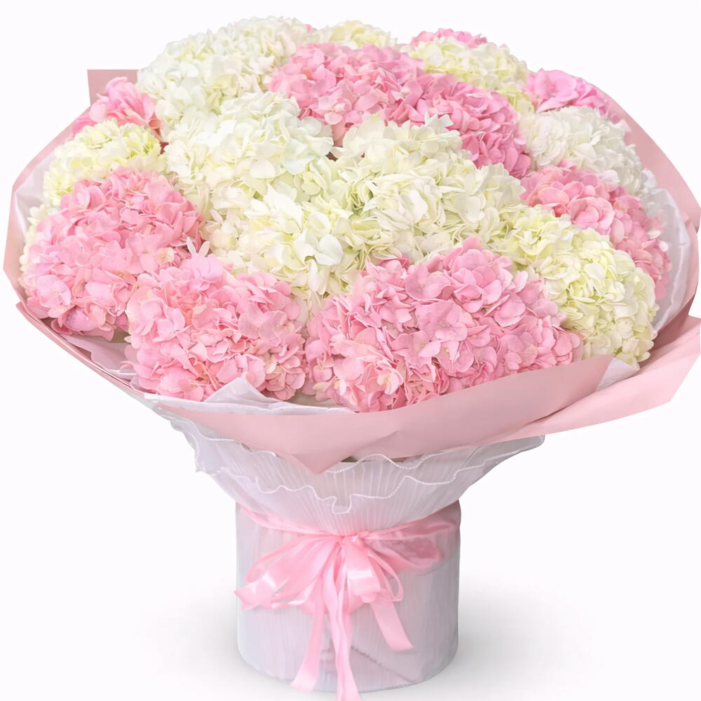 Soft, elegant, and beautifully abundant — the Blushing Clouds Hydrangea Bouquet is a luxurious arrangement designed to impress. Featuring 21 premium hydrangea stems in delicate shades of blush pink and creamy white, this bouquet creates a cloud-like fullness with a refined pastel aesthetic. Wrapped in elegant double-layer pink and white designer paper and finished with a satin pink ribbon, it radiates sophistication and grace.