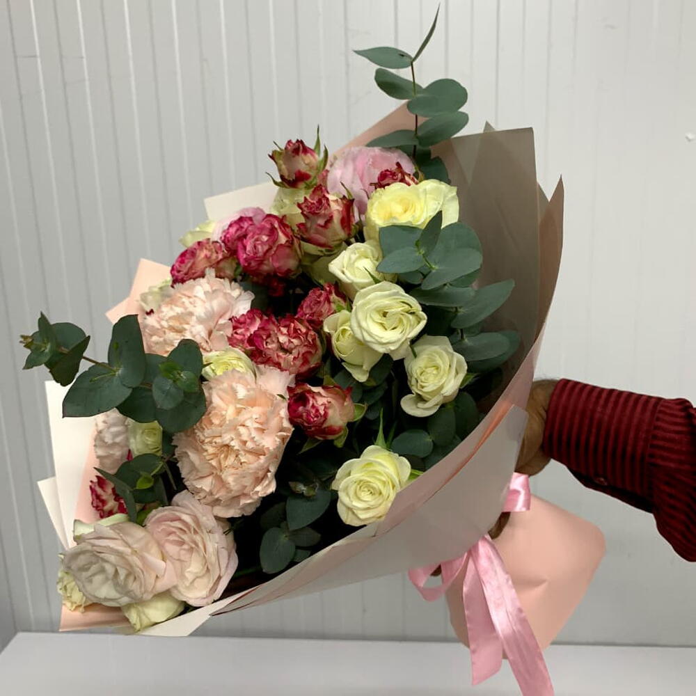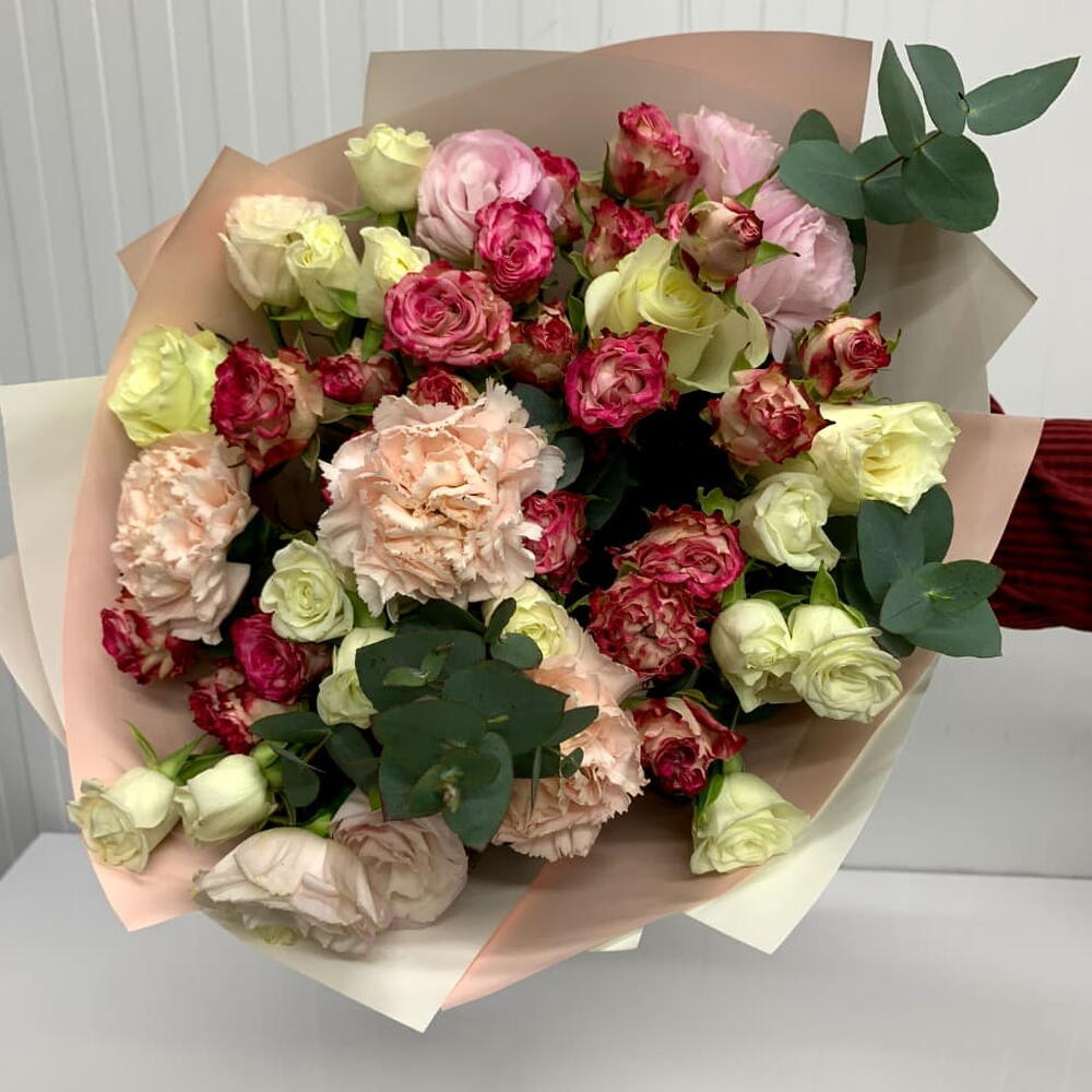 White rose - 3 ud. wrapping paper - 5 ud. rosa spray blanca - 3 ud. eucalyptus leaves - 3 ud. clavel melocotón - 3 ud. lisianthus rosa - 2 ud. corona de rosas spray - 4 ud.