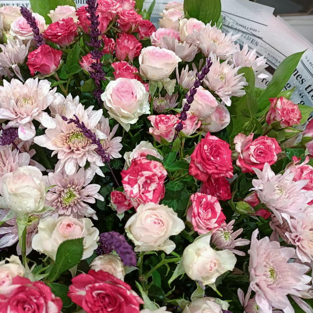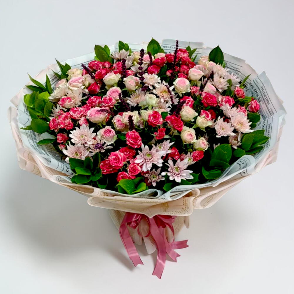This exquisite bouquet features a dense, lush mix of spray roses and miniature chrysanthemums in a gradient of hot pink, soft blush, and cream. Tucked between the blooms are delicate purple accents and rich green foliage, all expertly gathered in a unique vintage newspaper-print wrap. Finished with a graceful pink ribbon, it’s a perfect blend of modern elegance and old-world charm.