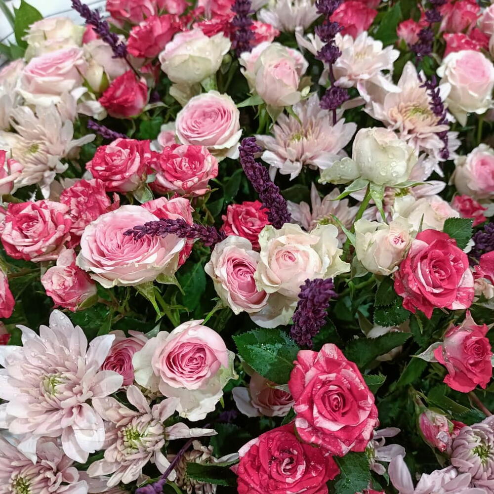 Ruscus - 20 ud. Spray rose - 20 ud. El crisantemo - 8 ud. lavanda - 16 ud.