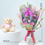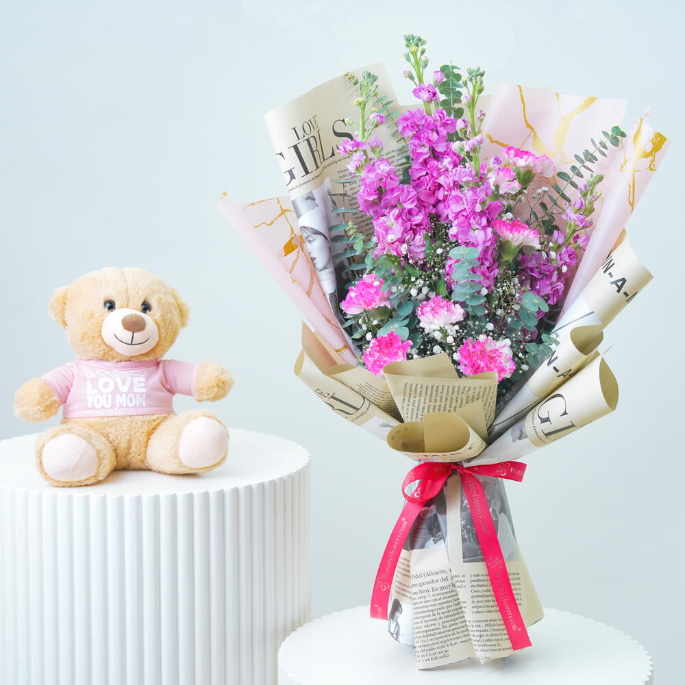Osito de peluche "Te quiero, mamá" de 25 cm 4 Mathiola rosas 7 claveles rosas 1 tallo de gypsophila 1 tallo de eucalipto Envuelto en papel de periódico blanco roto y papel de regalo rosa jaspeado Atado con una cinta rosa oscuro