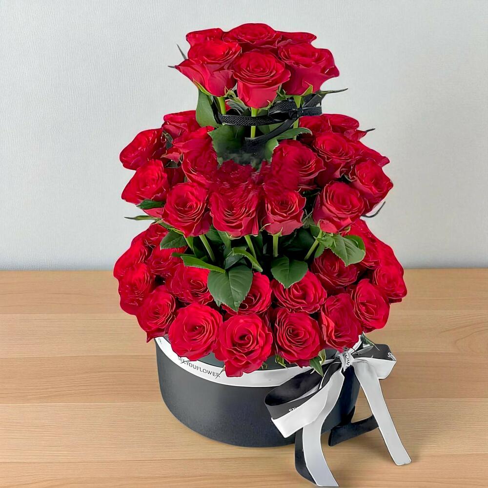 Hermoso arreglo con 70 rosas rojas en caja redonda