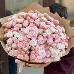 Un bombástico ramo de rosas spray estalla con flores exuberantes de múltiples pétalos agrupadas en delicados tallos ramificados. Cada rosa se abre en una esfera suave y festoneada, creando abundante volumen y textura. Los tonos suelen variar desde el rosa rubor hasta el melocotón cremoso, mezclándose en un arreglo romántico, como una nube. El ramo transmite una sensación lujosa pero fresca, con un encanto natural como recién recogido del jardín. Perfecto para celebraciones elegantes, equilibra refinamiento y fantasía, logrando una declaración llamativa mientras se mantiene suave y bellamente femenino.