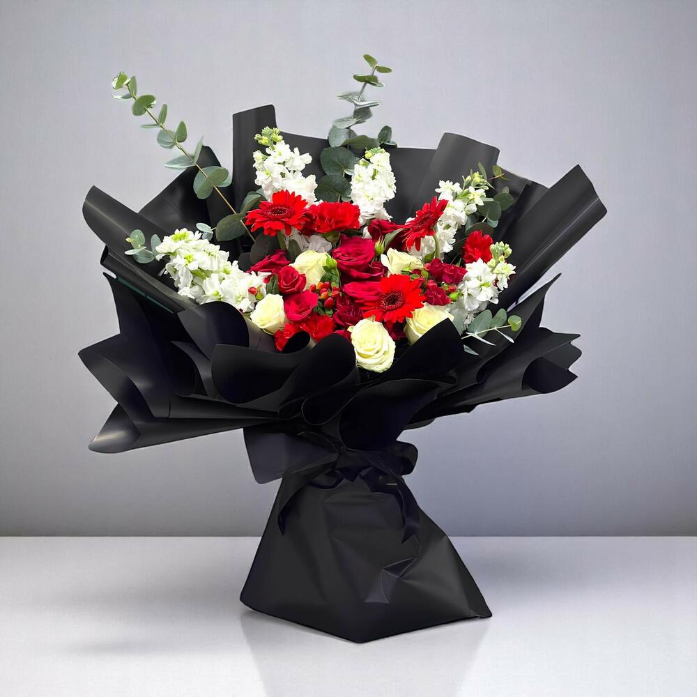 mini rosas rojas - 3 ud. rosas blancas - 5 ud. matthiolas blancas - 5 ud. gerberas rojas - 4 ud. eucalipto - 5 ud.