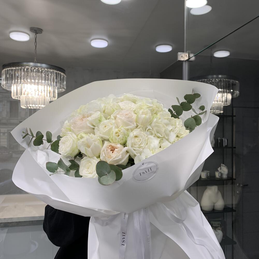 Eucalyptus - 1 ud. Tulips - 2 ud. rosas ohara blancas - 6 ud. hortensia - 2 ud.