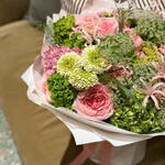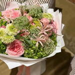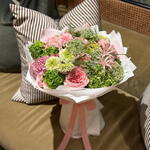 Hydrangea - 6 ud. Gerbera - 5 ud. rose - 7 ud. ranunculus - 5 ud. celosia - 3 ud. ammi - 6 ud. ramillete de rosas - 7 ud. clavel - 7 ud. eucalipto - 1 ud. nerine - 4 ud.
