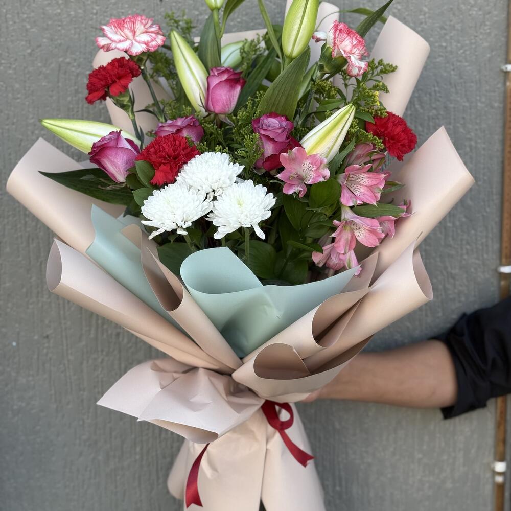 Crisantemo blanco - 1 ud. lily white - 2 ud. mezcla de claveles - 5 ud. rosas púrpura intensas - 4 ud. alstroemeria rosa - 1 ud.