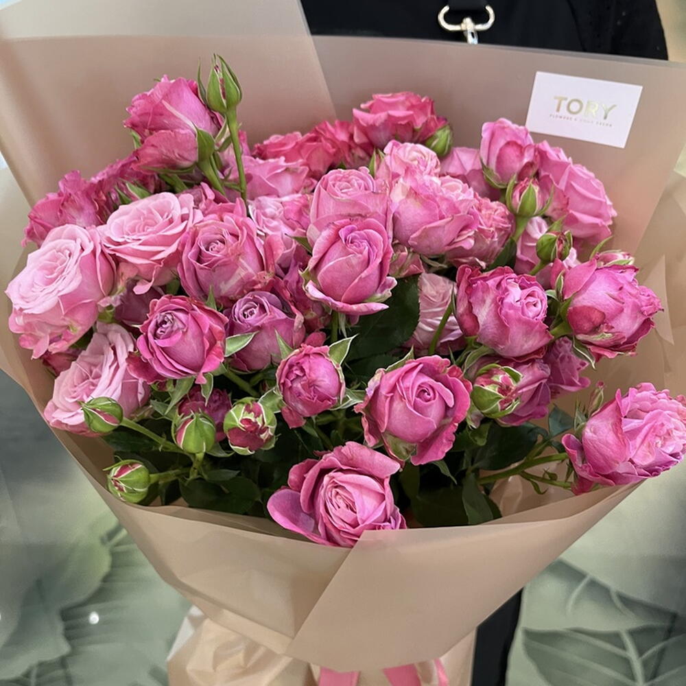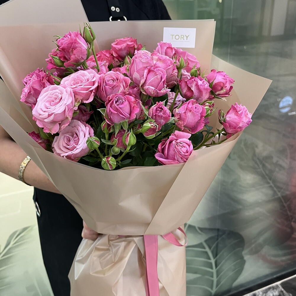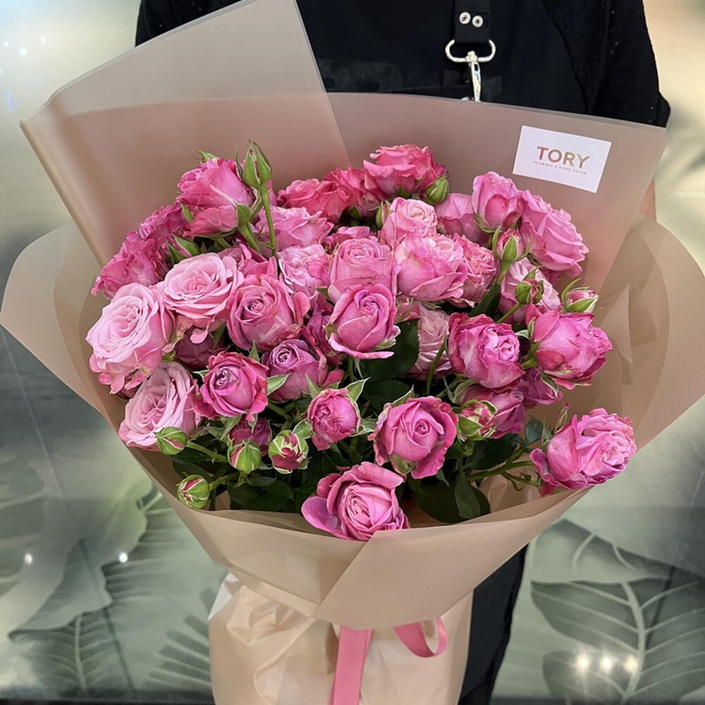 Composition: Rose spray Lady Bombastic - 9, wrapping - 1, ribbon - 1 Sizes: WIDTH - 26CM; HEIGHT - 55CM; LENGTH - 55CM; (including packaging) Размер: 26 x 55 x 55 см