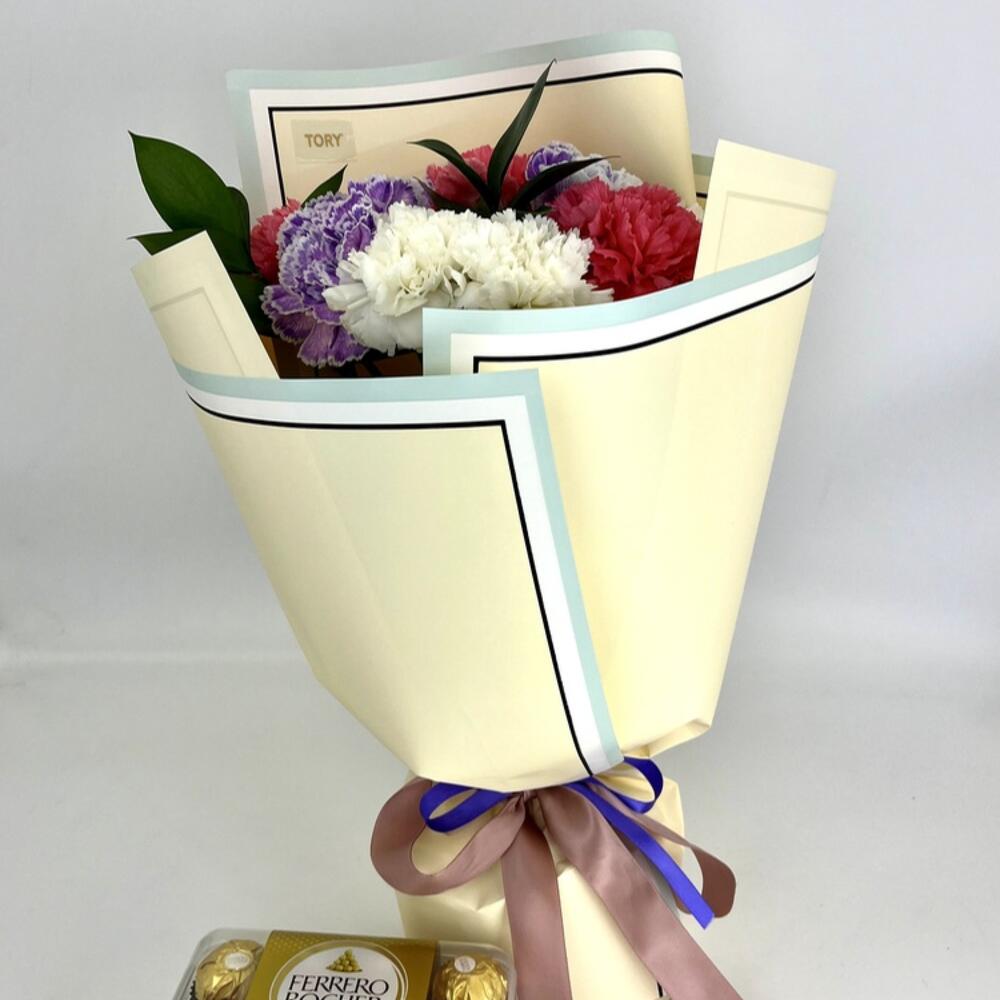 La cinta - 1 ud. Ruscus - 3 ud. dianthus - 6 ud. wrapping paper - 1 ud. chocolate Ferrero - 1 ud. dianthus teñido espacial - 6 ud.