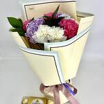 Composición: Clavel teñido degradado - 6, Clavel - 6, Ruscus - 3, Chocolate Ferrero - 1, Papel de regalo - 1, lazo - 1 Tamaños: ANCHO - 25CM; ALTURA - 50CM; LARGO - 50CM; (incluyendo embalaje) Tamaño: 25 x 50 x 50 cm