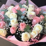 Un ramo incluye 15 rosas blancas, 10 rosas rosadas, 10 eucaliptos, 3 gipsofilas blancas, 3 gipsofilas rosadas. Una tarjeta de felicitación gratuita.