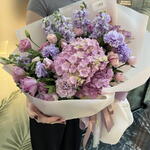 Composición: Hortensia - 1, Rosa spray Julieta melocotón - 3, Rosa morada oscura - 5, Clavel - 7, Mattiola - 7, Pistacia - 4, Lisianthus - 3, Papel de regalo floral - 1. Medidas: Ancho - 65 cm; Alto - 65 cm; Largo - 65 cm (incluido el embalaje).