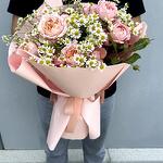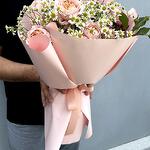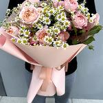 Composición: 8 flores de manzanilla, 4 rosas Julieta color melocotón, 1 papel de regalo y 1 cinta. Medidas: 50 cm de ancho, 60 cm de alto y 60 cm de largo (incluido el embalaje). Dimensiones: 50 x 60 x 60 cm.
