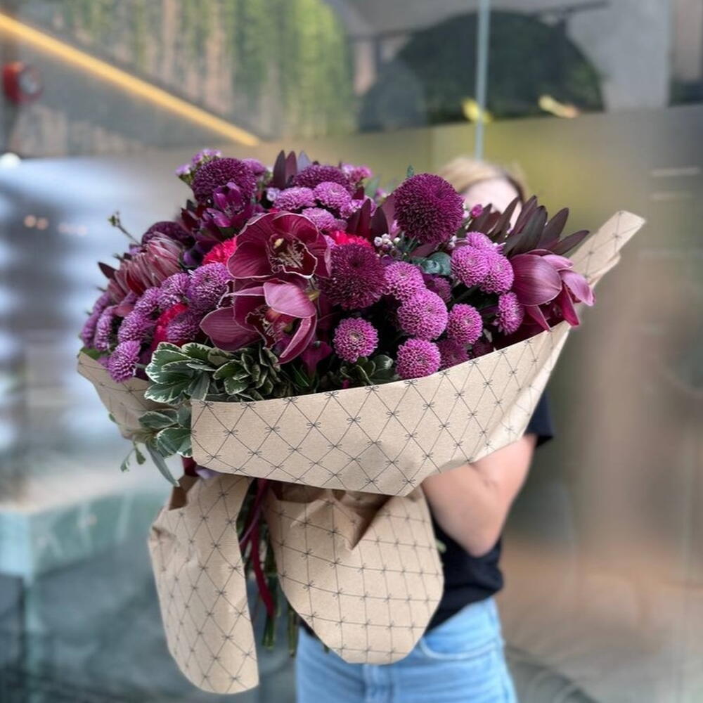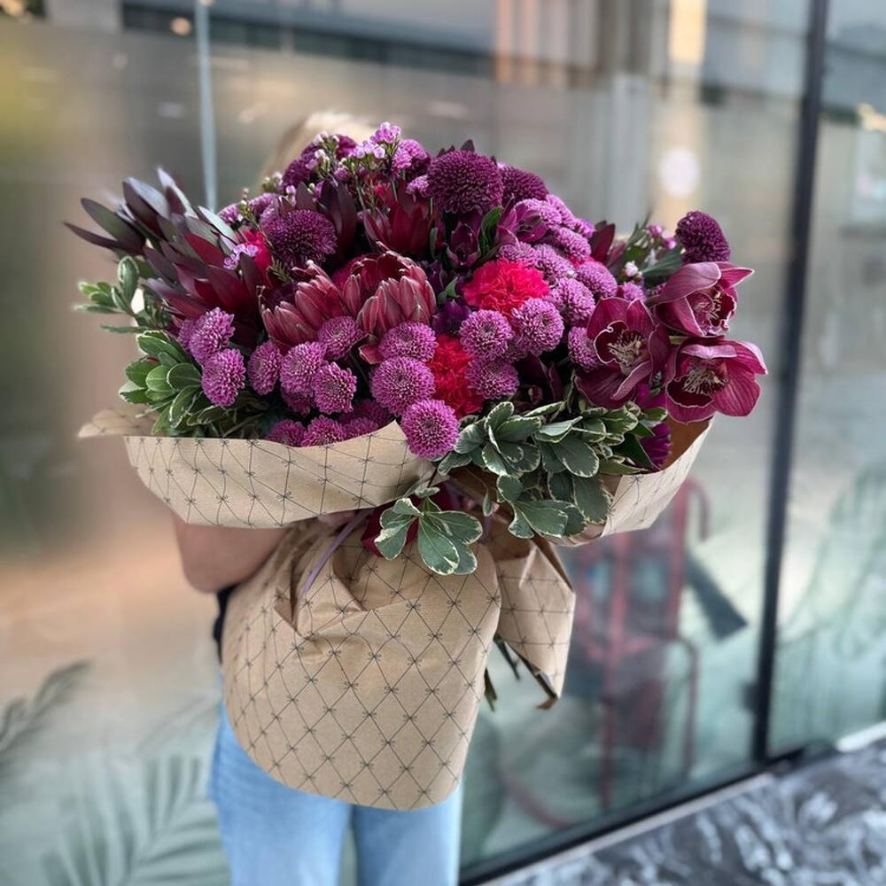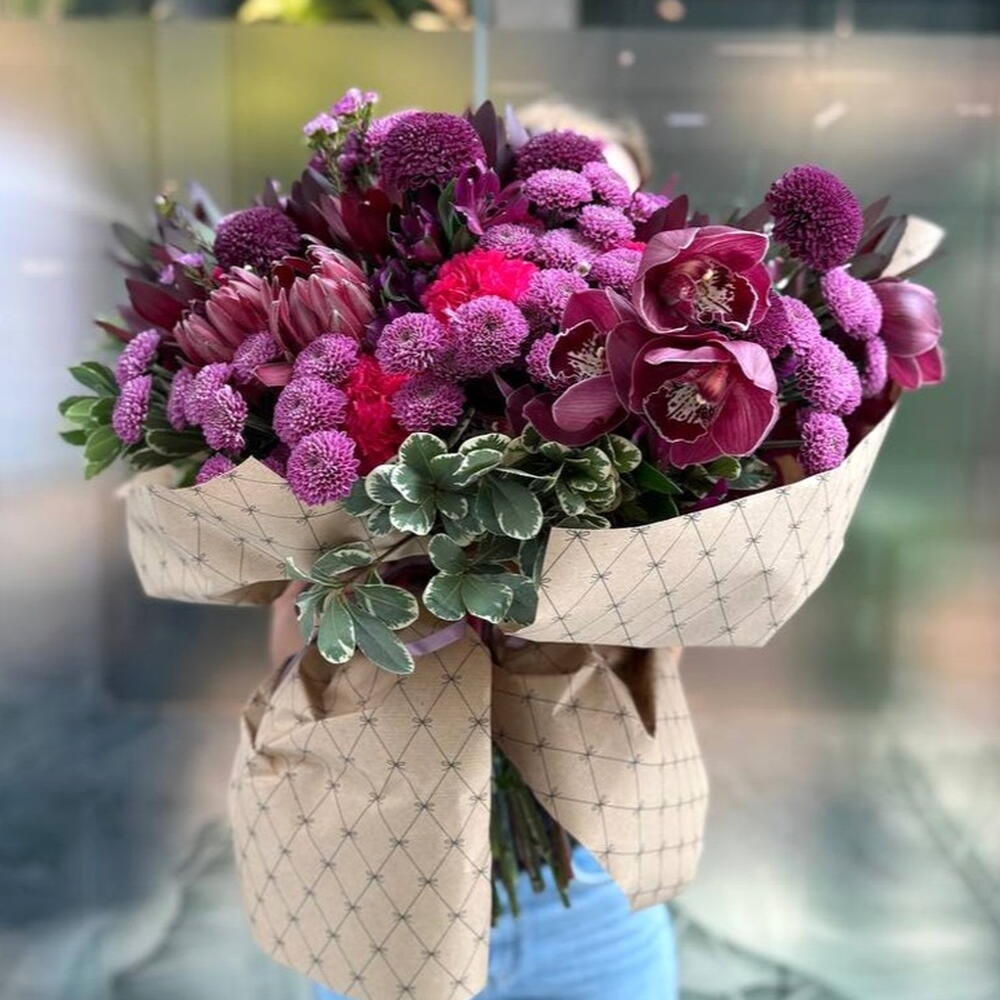 Composición: Dianthus - 6, Chrysanthemum Momoko - 10, Protea - 3, Chrysanthemum Santini - 20, Cymbidium - 11, Leucadendron - 10, Pittosporum - 7, Chamelacium - 10, Alstroemeria - 8 Tamaños: ANCHO - 55CM; ALTO - 55CM; LARGO - 55CM; (incluyendo el embalaje) Tamaño: 55 x 55 x 55 cm