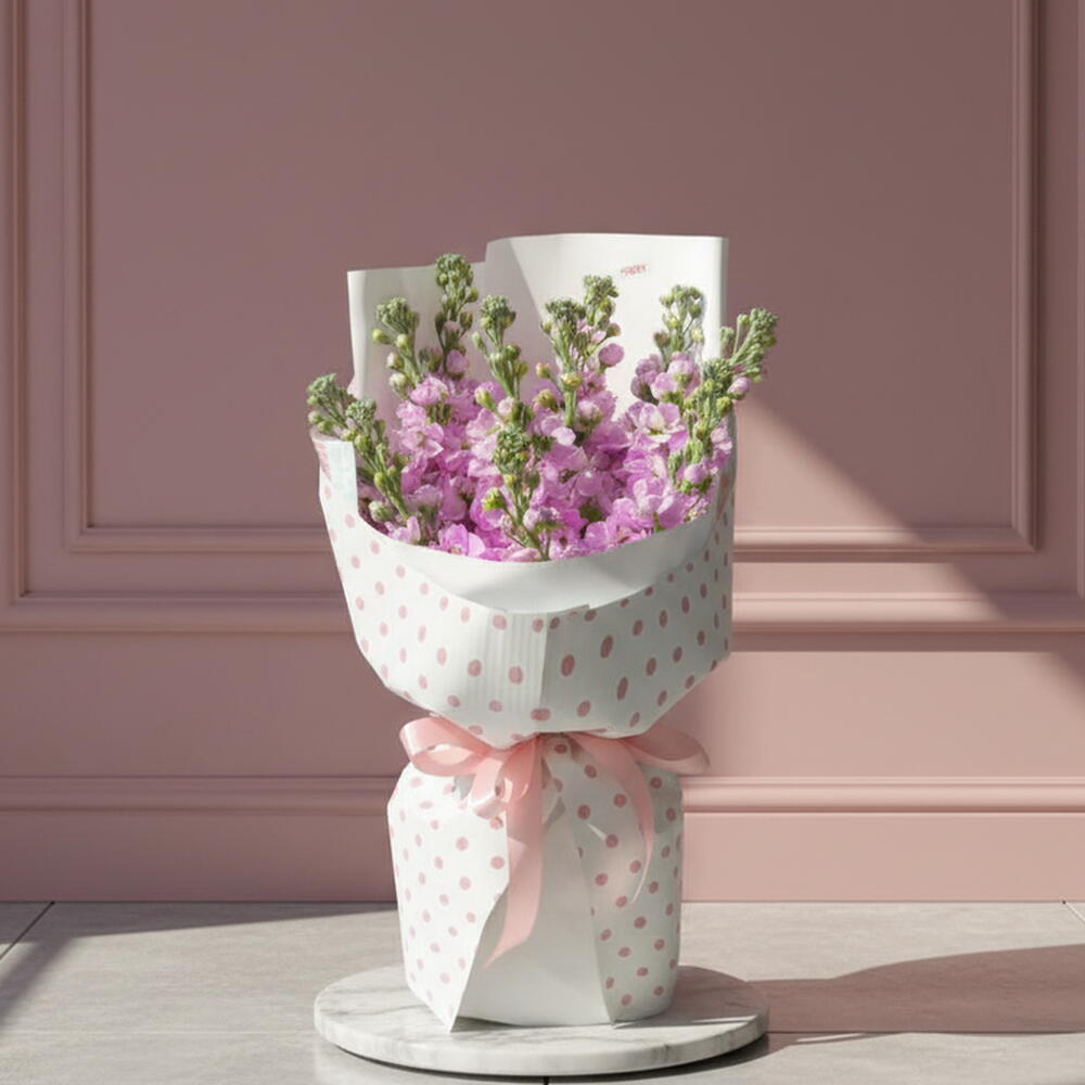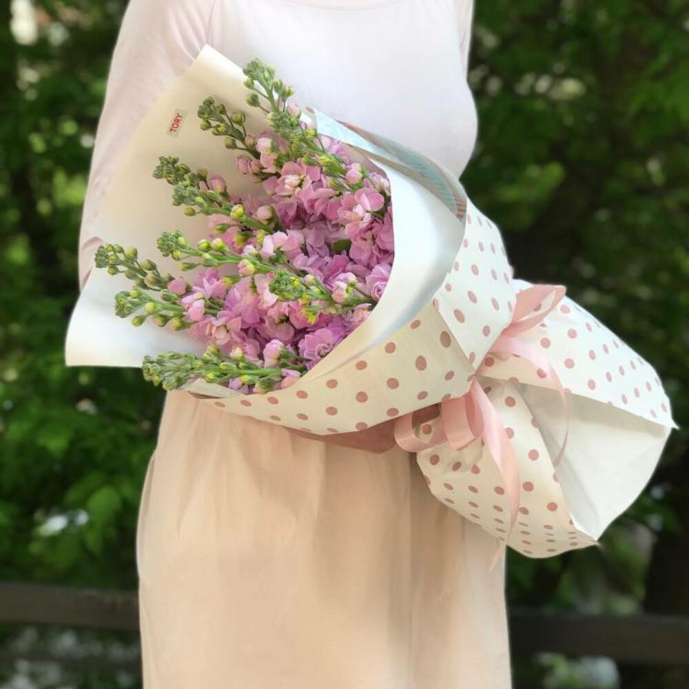 Composition: Matthiola - 11, Wrapping - 3, Ribbon - 1 Sizes: WIDTH - 25CM; HEIGHT - 50CM; LENGTH - 50CM; (including packaging) Размер: 25 x 50 x 50 см