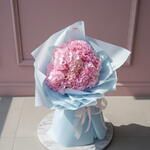 Composition: Hydrangea pink - 5, wrapping - 3, ribbon - 2 Sizes: WIDTH - 45CM; HEIGHT - 60CM; LENGTH - 60CM; (including packaging) Размер: 45 x 60 x 60 см