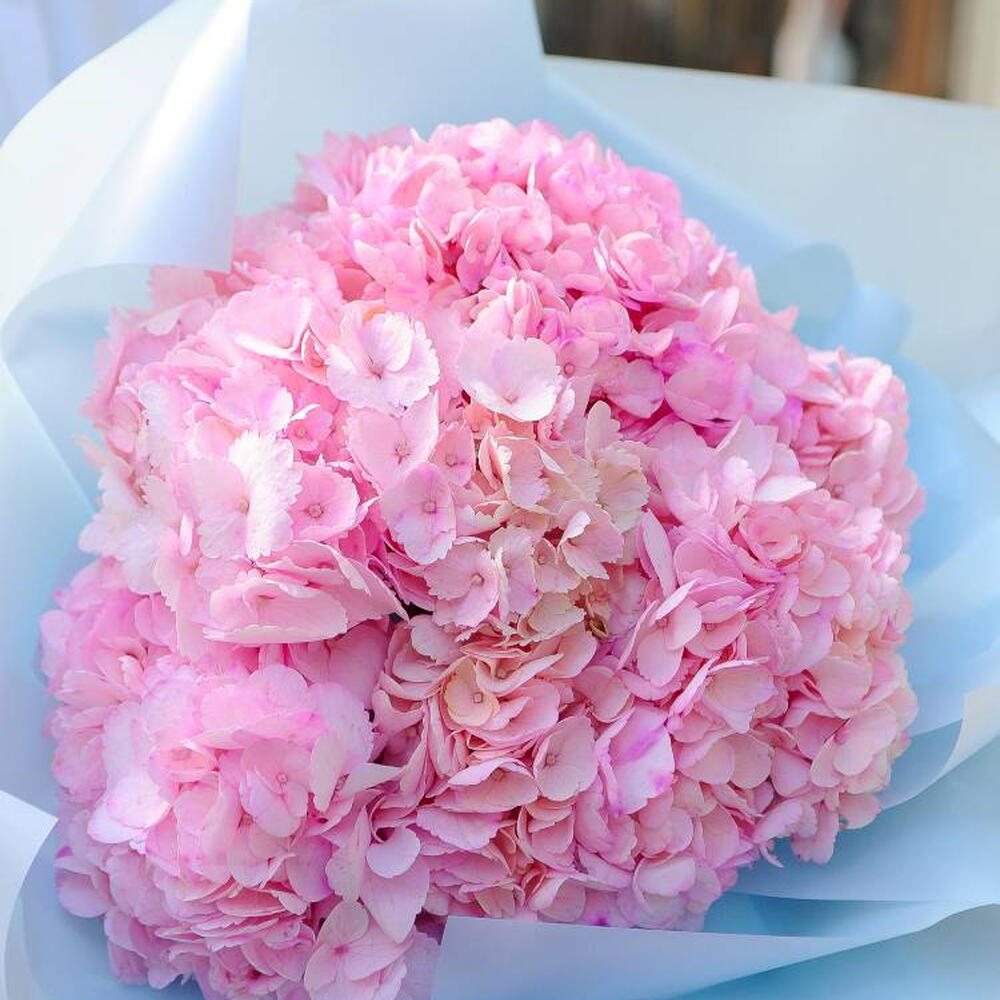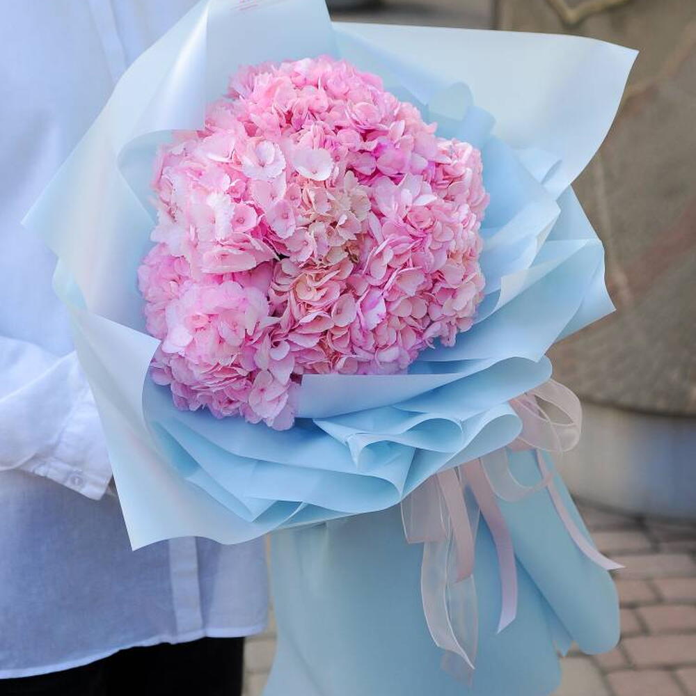 Composition: Hydrangea pink - 5, wrapping - 3, ribbon - 2 Sizes: WIDTH - 45CM; HEIGHT - 60CM; LENGTH - 60CM; (including packaging) Размер: 45 x 60 x 60 см
