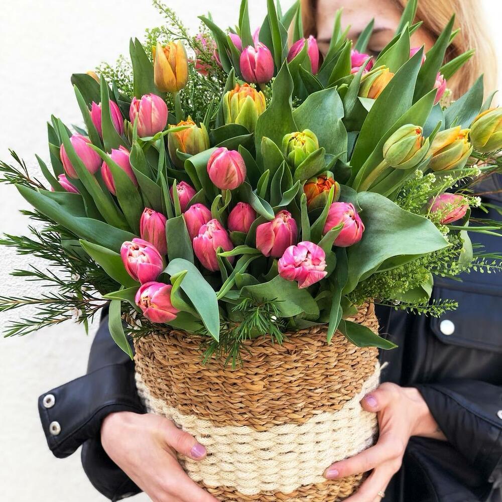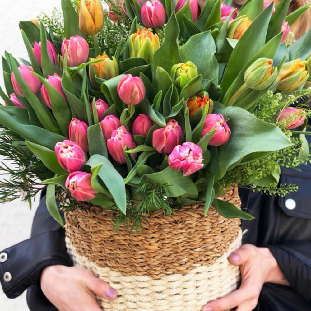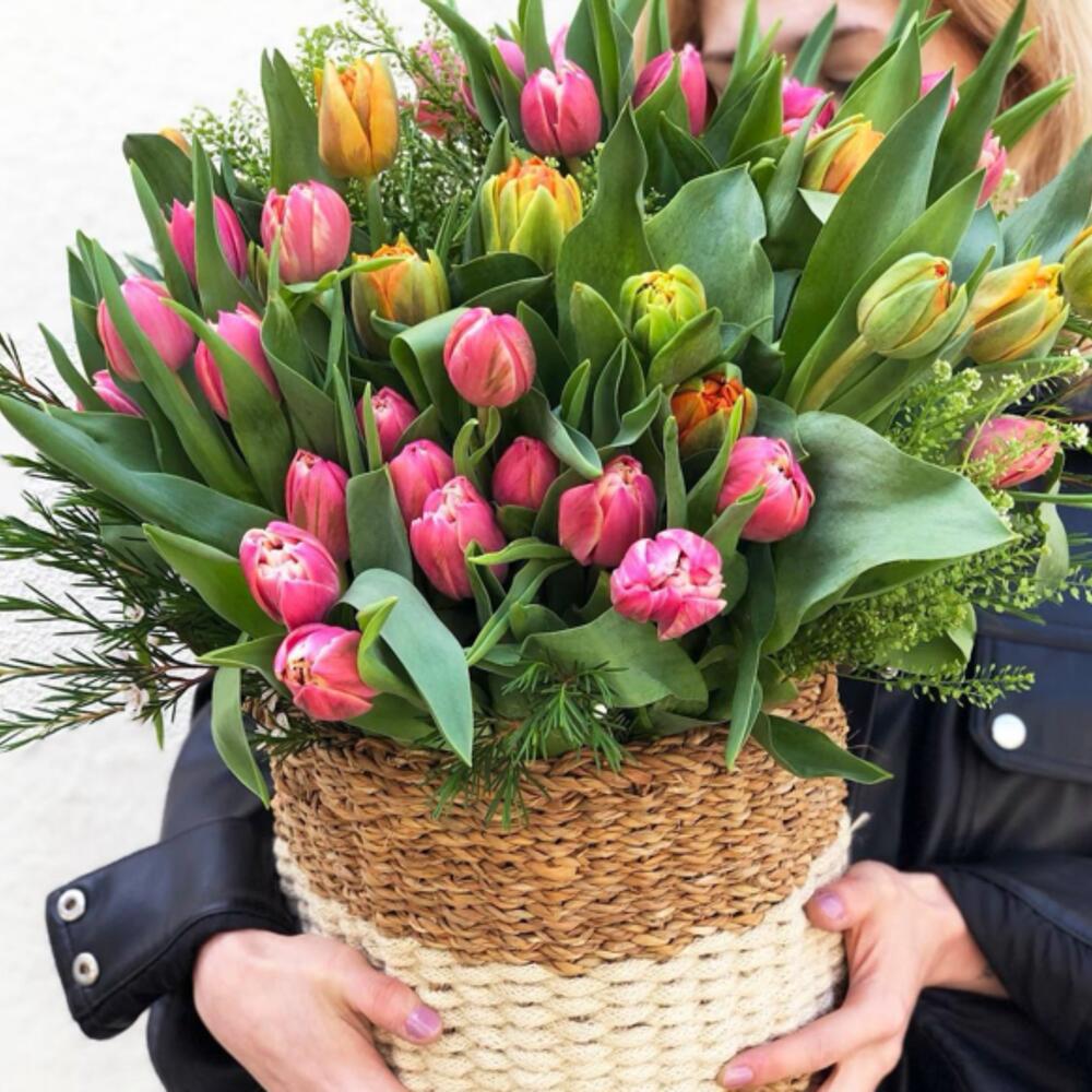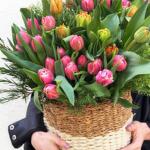 Satin ribbon - 2 ud. Greenery - 50 ud. Basket - 1 ud. Oasis - 3 ud. tarjeta - 1 ud. buenos sentimientos - 100 ud. instrucción - 1 ud. surtido de tulipanes peonía - 51 ud.