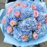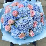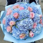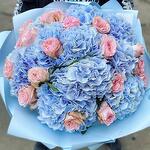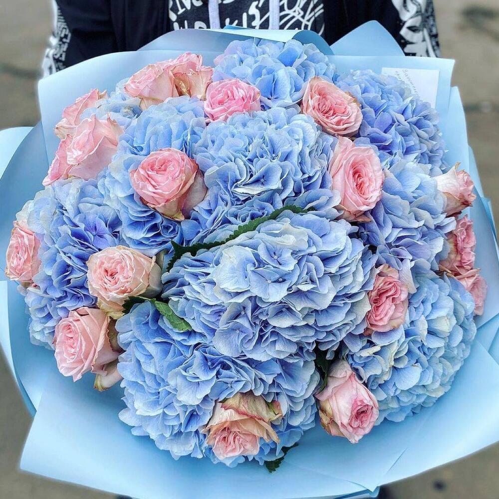 Ramo de hortensias azules y rosas tipo peonía rosadas