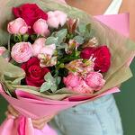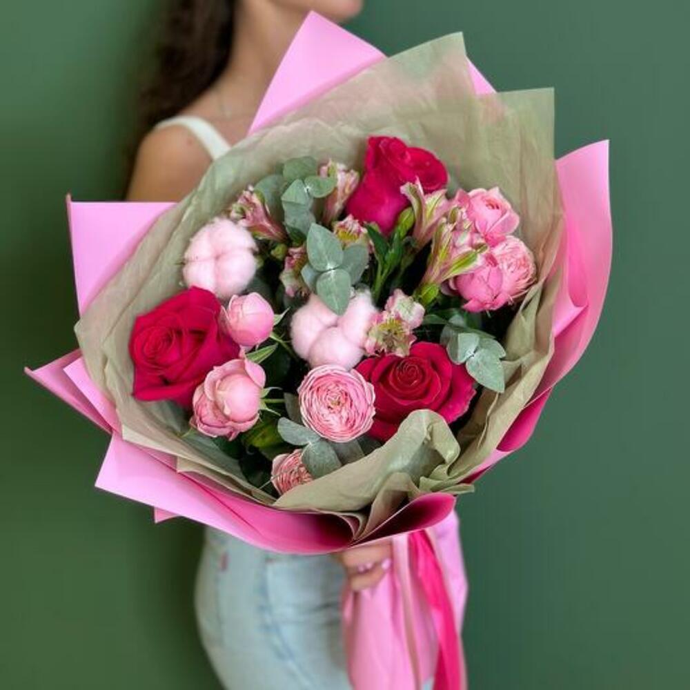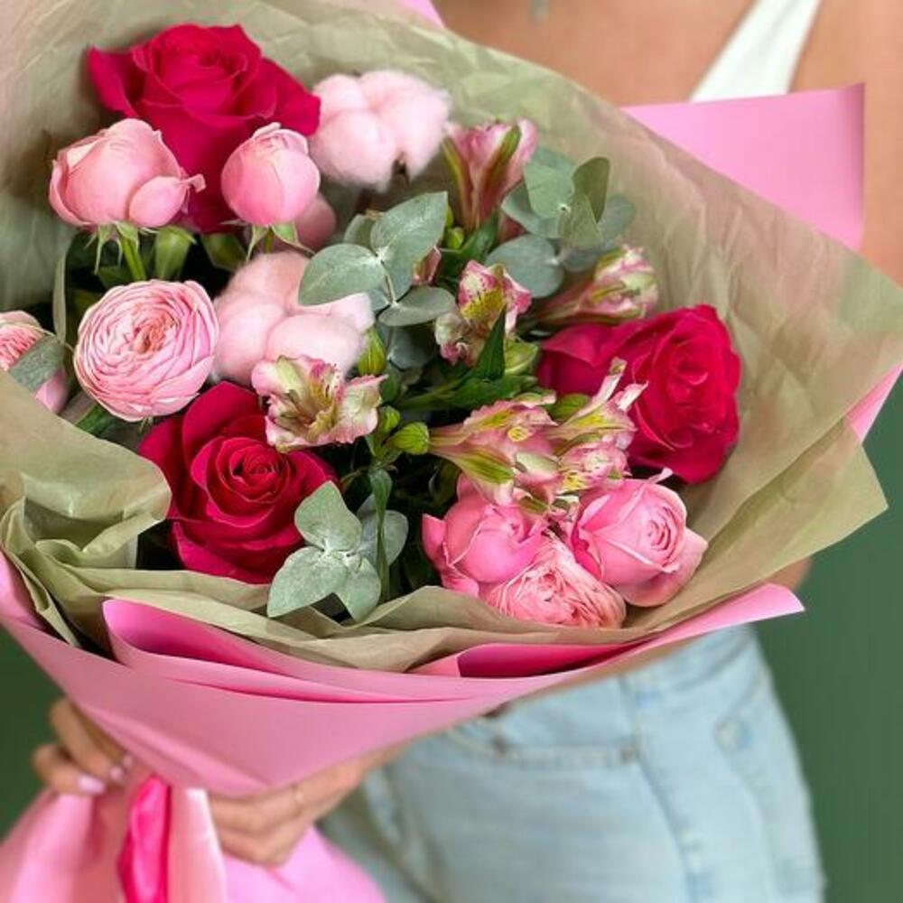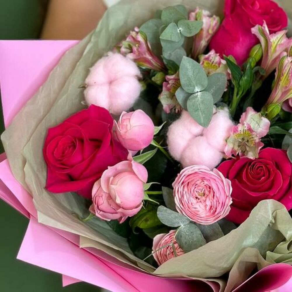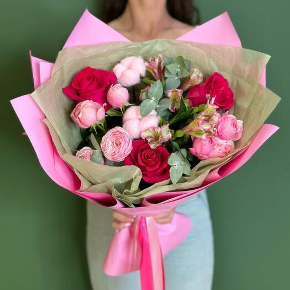 Alstroemeria - 2 ud. packaging - 1 ud. algodón rosa - 2 ud. rosa pink floyd - 3 ud. rama de eucalipto - 1 ud. sylva rosa en spray - 2 ud.
