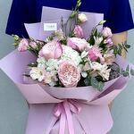 Composición: hortensia - 2, rosa David Austin - 4, pistacia - 3, alstroemeria - 4, lisianthus - 2, eucalipto - 2, papel de regalo - 1, cinta - 1 Tamaños: ANCHO - 40CM; ALTO - 45CM; LARGO - 45CM; (incluyendo el embalaje) Tamaño: 40 x 45 x 45 cm