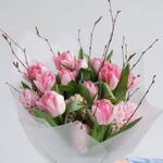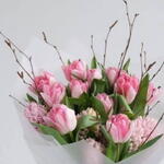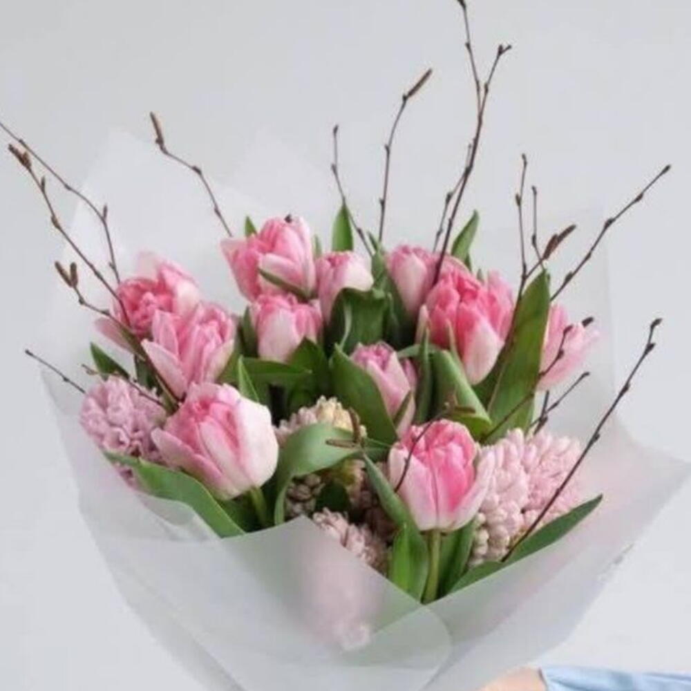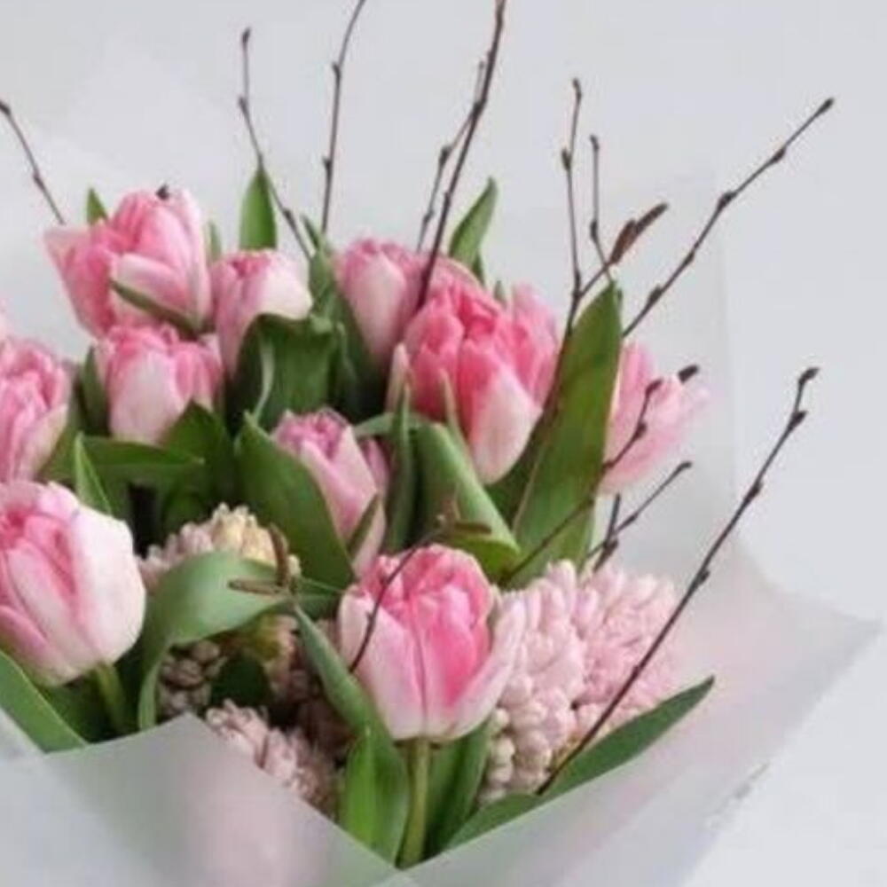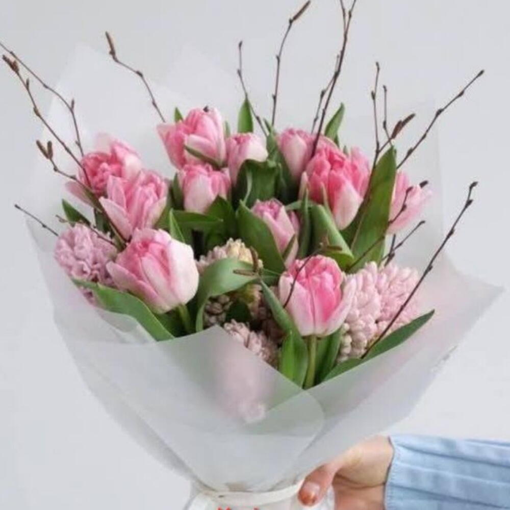 Wrapping - 2 ud. Jacinto - 10 ud. postal - 1 ud. tulipán rosa - 11 ud. llorar - 1 ud. cinta - 1 ud. ramitas decorativas - 10 ud.