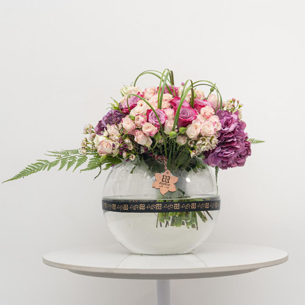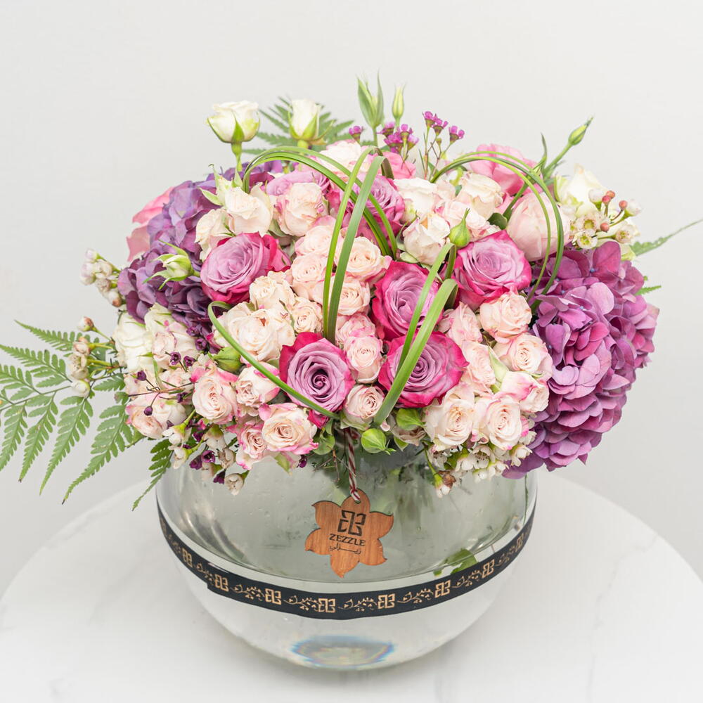 Enriquezca la elegancia de su interior con este exquisito arreglo floral. Esta composición incluye una encantadora mezcla de 2 hortensias moradas, que se combinan de forma impactante con 15 delicadas rosas rosas en spray y 10 elegantes rosas moradas. Siete rosas rosas, perfectamente ubicadas en el centro del conjunto, crean un equilibrio con su vibrante tono. El espectáculo floral se acentúa con 10 flores de hierba de acero que ondean de forma fascinante. Todas estas espectaculares flores se encuentran en un delicado jarrón de 20D, realzando su belleza. Este singular surtido es la pieza perfecta para añadir un toque de elegancia y encanto natural a su espacio.