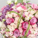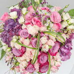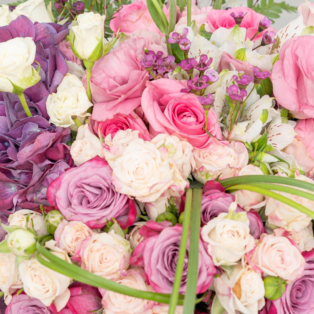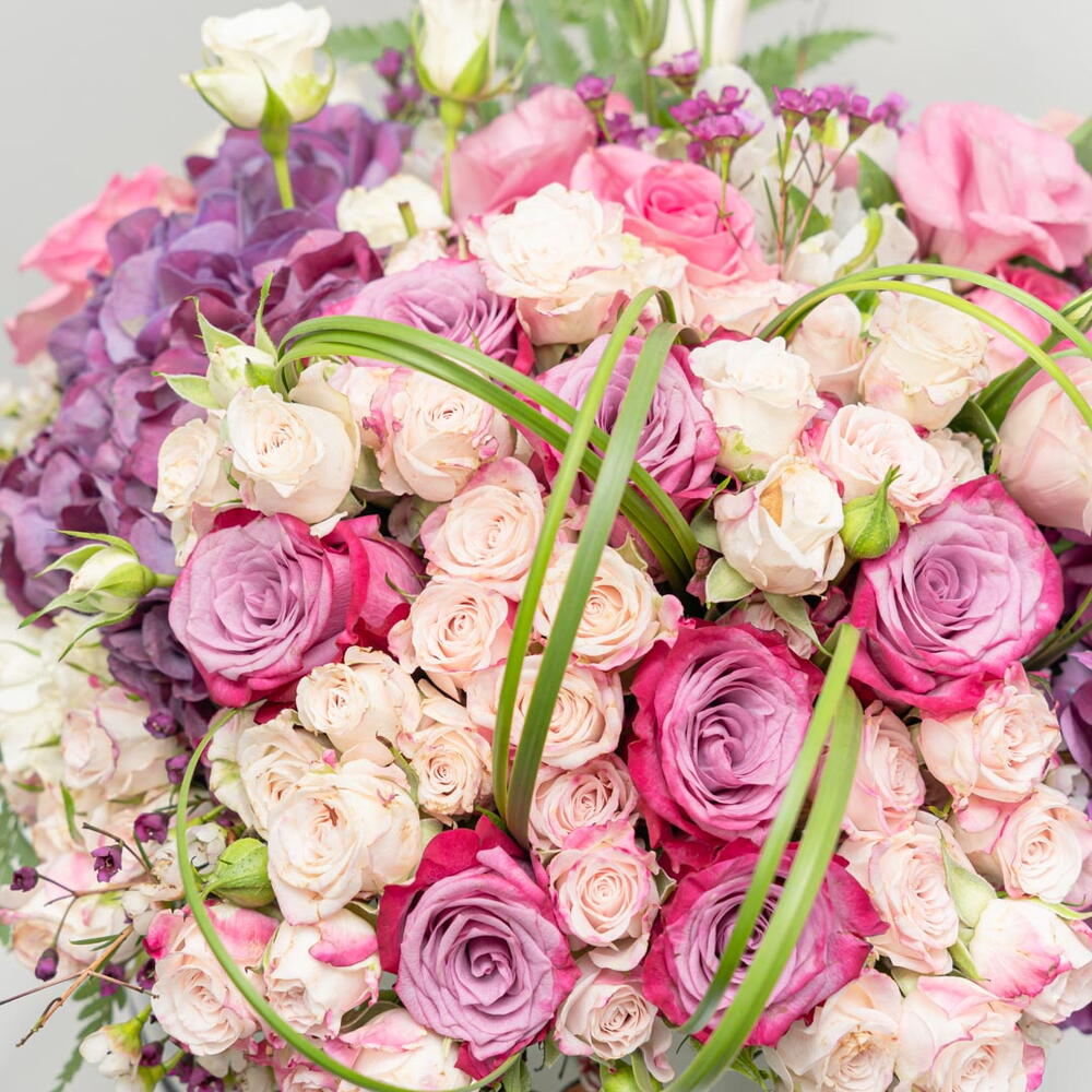 rose pink - 7 ud. rosa morada - 10 ud. spray rose pink - 15 ud. hortensia morada - 2 ud. hierba de acero - 10 ud. bol 20 d - 1 ud.