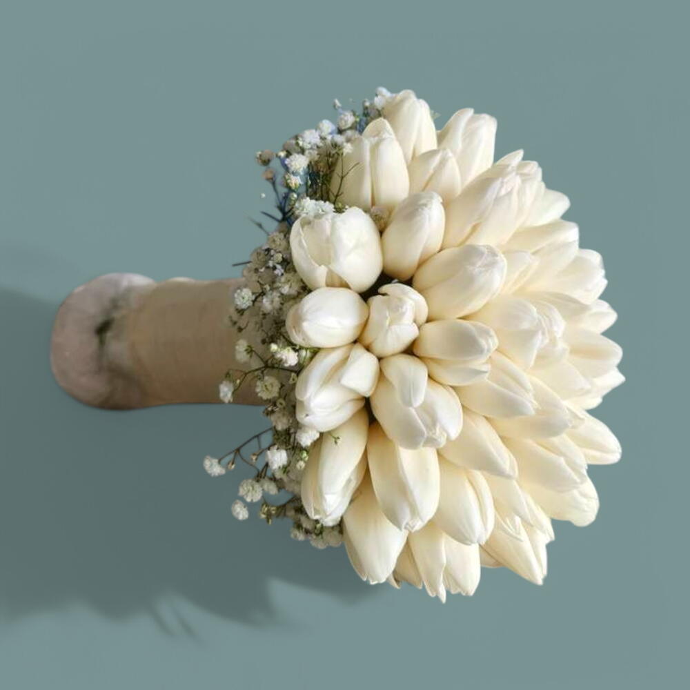 Un ramo de novia bellamente compacto que presenta una disposición densa de tulipanes blancos inmaculados, acentuado con delicada gypsophila blanca (aliento de bebé). Los tallos están envueltos en una tela suave y de tono neutro, creando un ramo nupcial clásico y elegante.