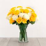 Un fantástico arreglo en un jarrón de vidrio transparente con 24 rosas blancas y de un amarillo brillante. Envía este arreglo hoy para sacar una sonrisa y traer felicidad a tu ser querido.
