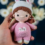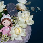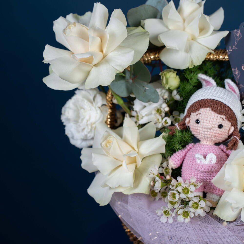 Eucalyptus - 1 ud. Teddy bear - 1 ud. Eustoma white - 2 ud. rose white - 5 ud. asparagus - 1 ud. blanco ceroso - 1 ud. organza rosa - 1 ud.