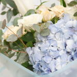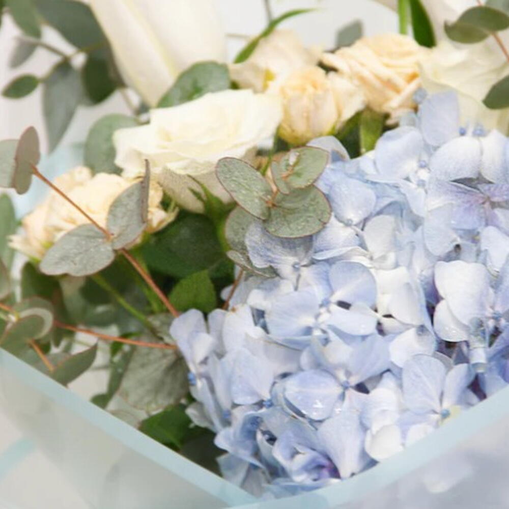 Eucalyptus - 4 ud. Lily - 1 ud. White rose - 3 ud. blue hydrangea - 1 ud. rosa bebé melocotón - 3 ud.