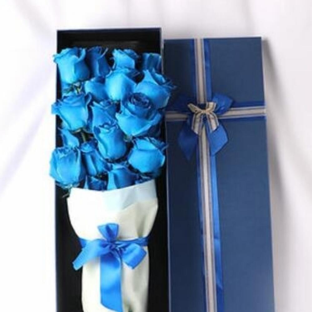 Una lujosa caja de 25 rosas azules premium, bellamente arregladas y envueltas en papel blanco suave con una elegante cinta de satén azul. Presentadas en una caja de regalo azul mate con un toque de detalle de cinta, este arreglo es el símbolo perfecto de pureza, elegancia y amor eterno.