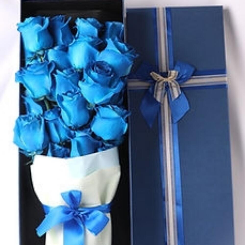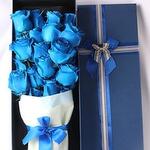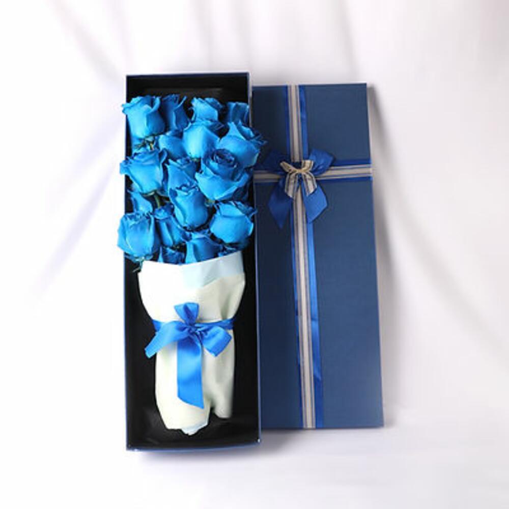 Una lujosa caja de 25 rosas azules premium, bellamente arregladas y envueltas en suave papel blanco con un elegante lazo de satén azul. Presentadas en una caja de regalo azul mate con un detalle de lazo, este arreglo es el símbolo perfecto de pureza, elegancia y amor eterno.