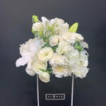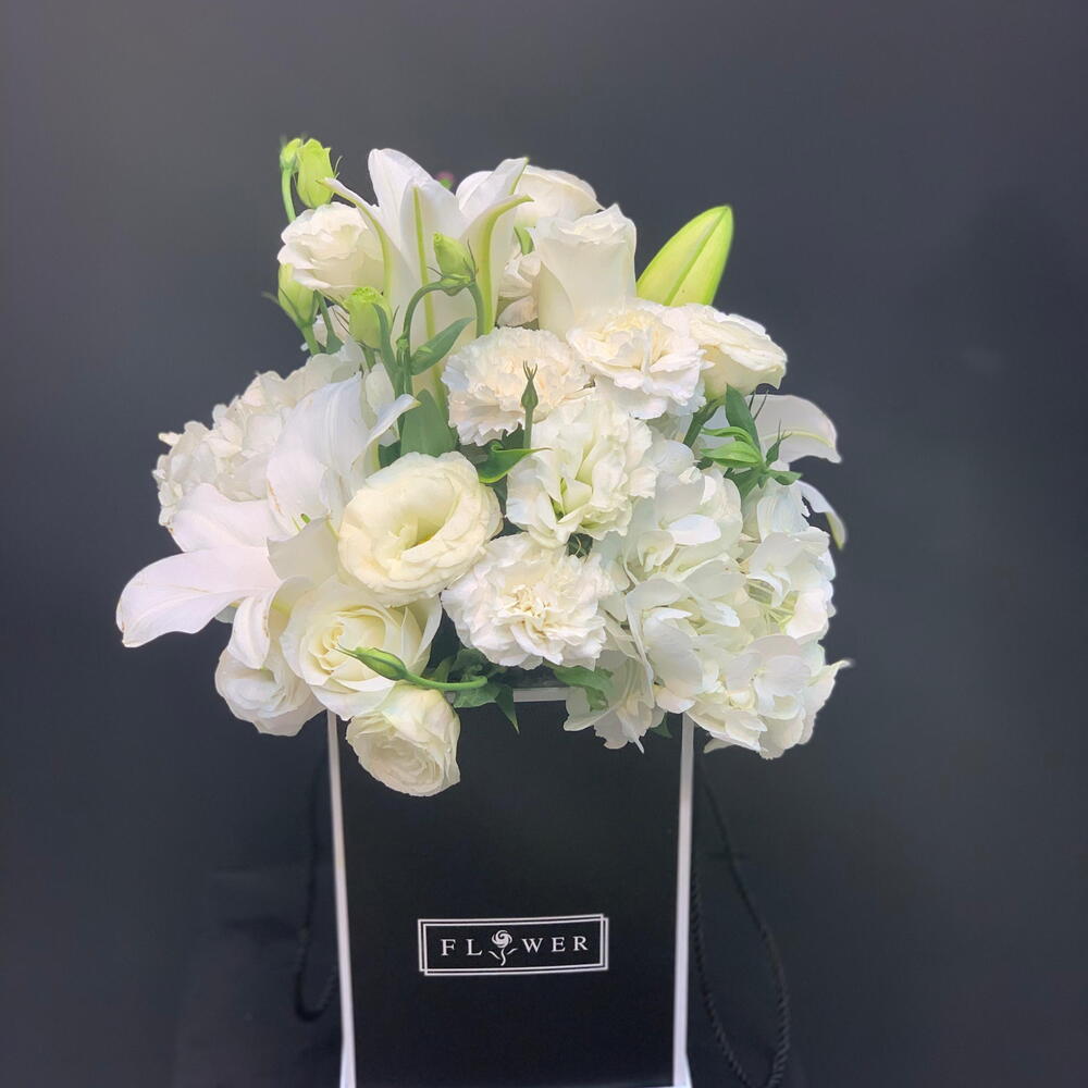 carnation - 5 ud. casablanga - 1 ud. hortensia - 2 ud. en una caja negra - 1 ud. roses - 5 ud. lisianthus - 3 ud.