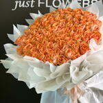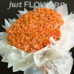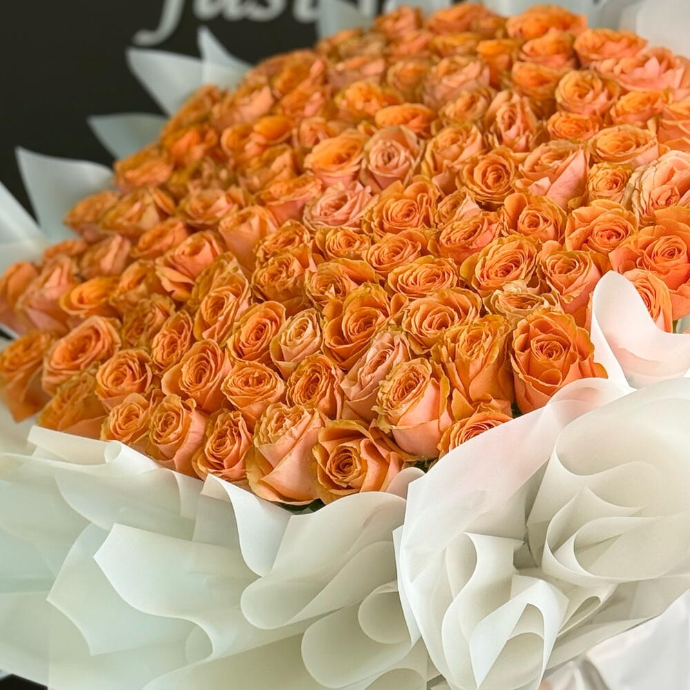 Un arreglo impresionante, elaborado con docenas de rosas premium de color naranja cósmico, artísticamente dispuestas en forma de corazón perfecto. Cada rosa luce vibrantes pétalos color melocotón anaranjado con un suave brillo luminoso, creando una atmósfera cálida y romántica. Envuelto en lujoso papel blanco de primera calidad con elegantes pliegues y rematado con una delicada cinta a juego, este ramo es ideal para grandes celebraciones, aniversarios, pedidas de mano y gestos románticos inolvidables. Una deslumbrante declaración de amor y elegancia.