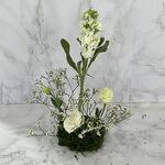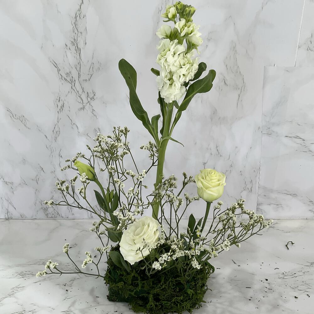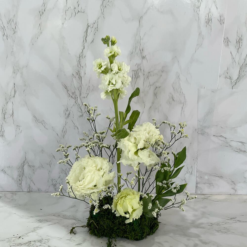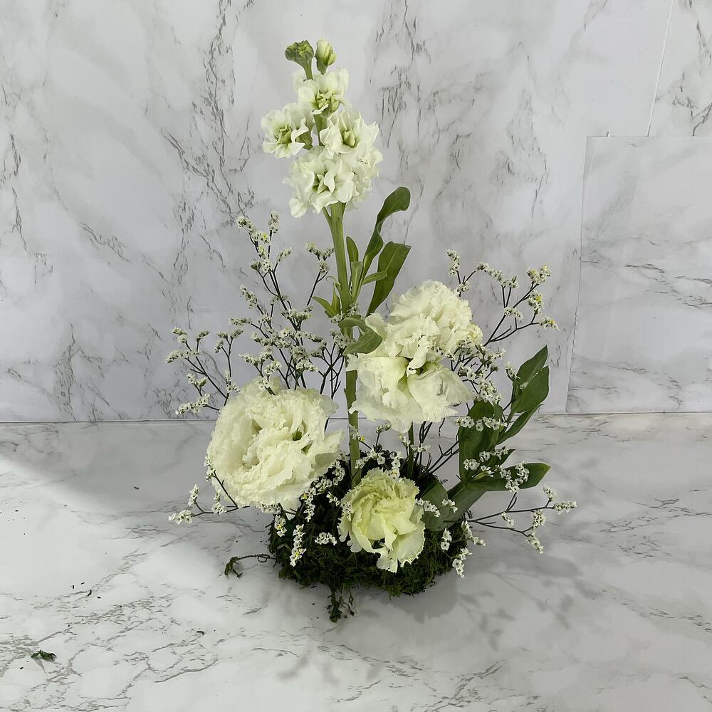 Limonium - 1 ud. Eustoma white - 1 ud. hierba - 1 ud. mathiyolla blanco - 1 ud. oasis de espuma local - 1 ud.